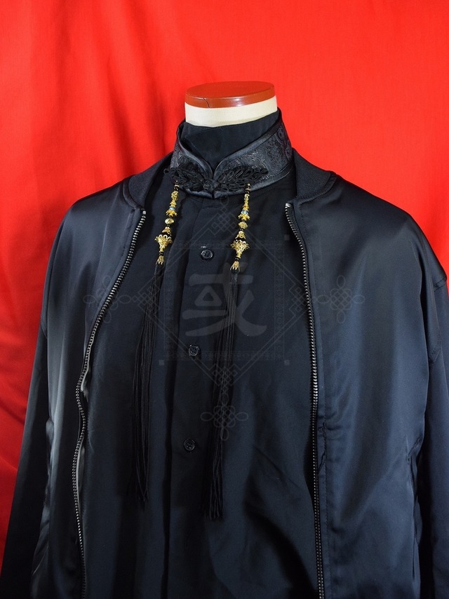 中華襟チョーカー(黒水紋扇)Sサイズ[AR-SC431] チョーカータイプの付け襟 着脱:チャイナボタン 生地:黒地に水紋 ボタン:黒 縁取り:黒 装飾:銀色の結びモチーフ、偏光模様の絵玉、水墨画のような扇、銀色の装飾、黒いタッセル 装飾全長:約30cm ※梱包代、販売手数料込み ※生地、パーツが強いの日光や湿気に弱いため、保管にご注意ください。 ※再販不可