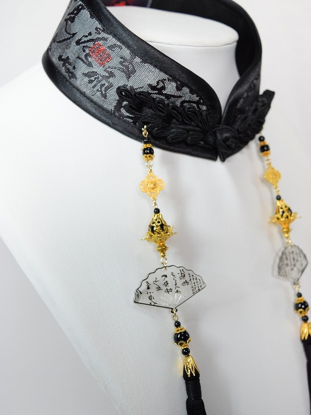 中華襟チョーカー(墨文字)Mサイズ[AR-SC438] チョーカータイプの付け襟 着脱:チャイナボタン 生地:黒い文字と赤い落款模様 ボタン:黒 縁取り:黒 装飾:金色の紋様のモチーフ、金色の刻印の梵字の石、文字の柄の扇のモチーフ、 黒いビーズと金色の装飾、黒いタッセル 装飾全長:約35㎝ ※梱包代、販売手数料込み ※生地、パーツが強いの日光や湿気に弱いため、保管にご注意ください。 ※再販不可