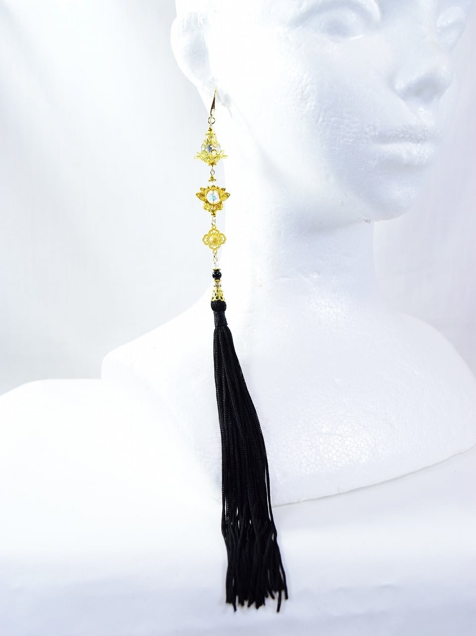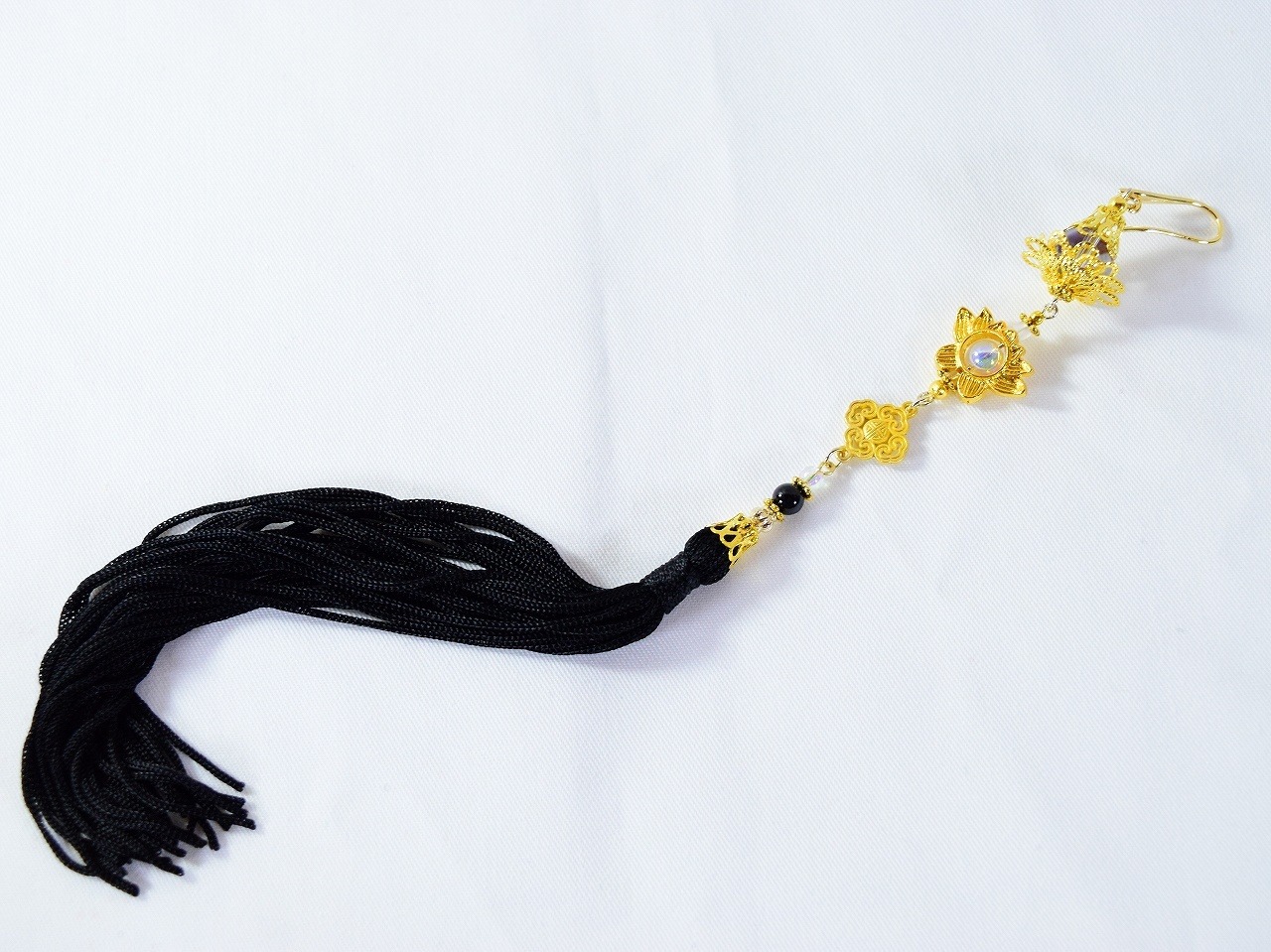 オーロラに反射する石に蓮を飾り、紋様モチーフと黒いタッセル