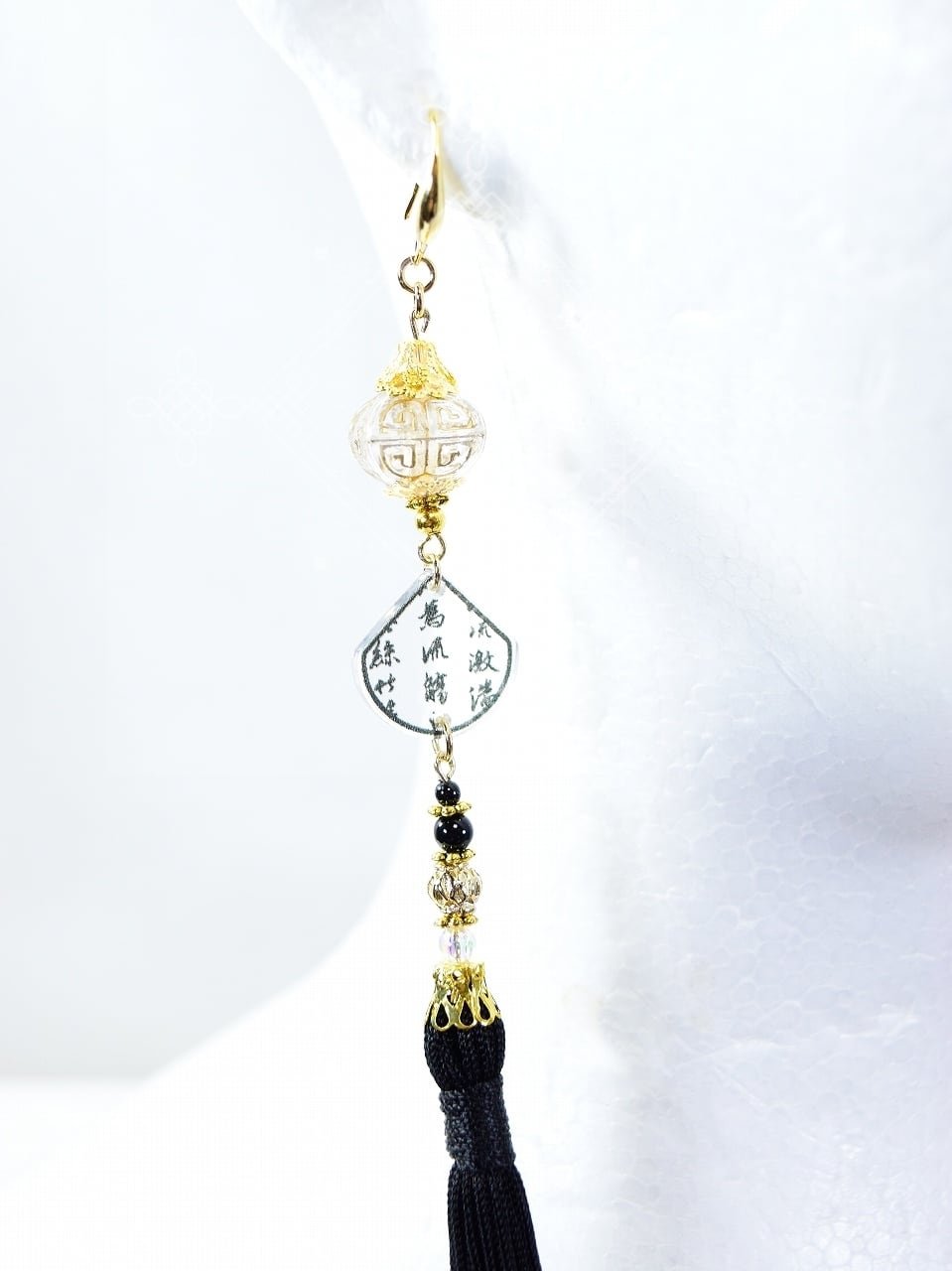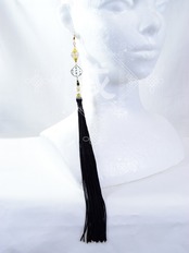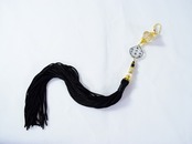 紋様モチーフと文字の書かれたパーツ、黒いタッセル