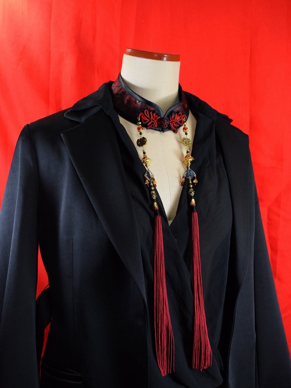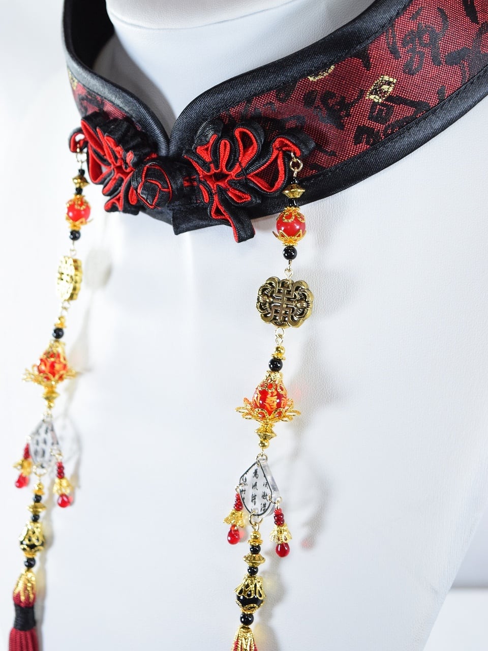 赤と黒のビーズ、金色の装飾、臙脂のタッセル