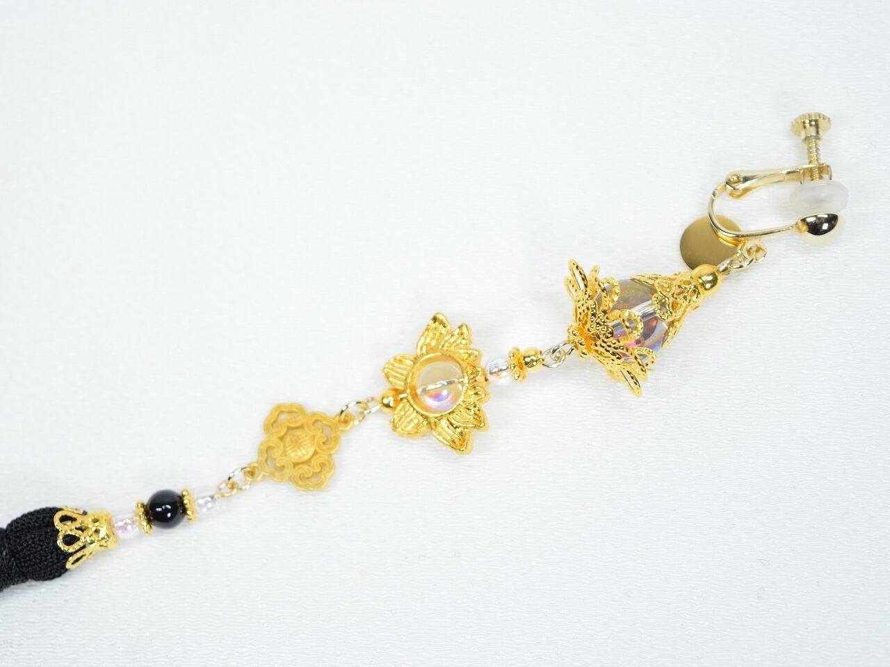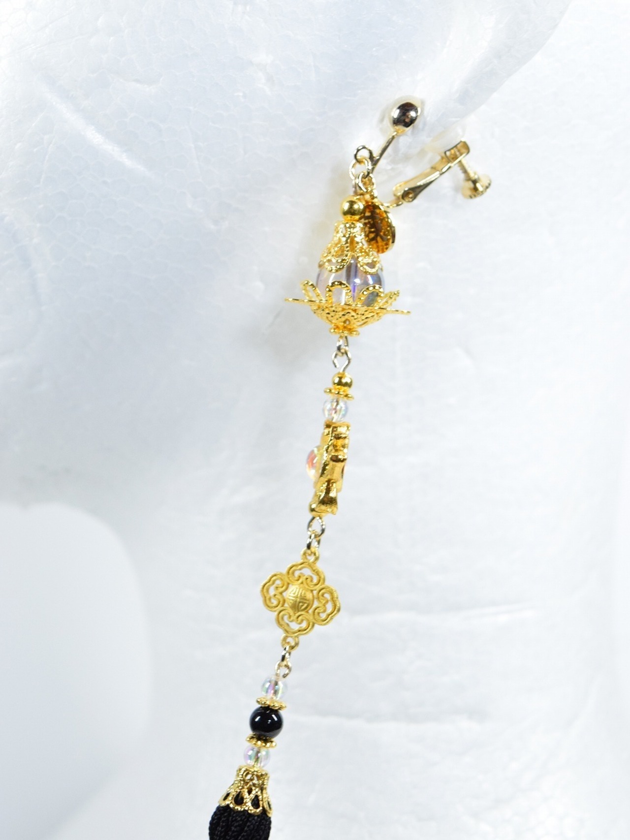 オーロラに反射する石に蓮を飾り、紋様モチーフと黒いタッセル