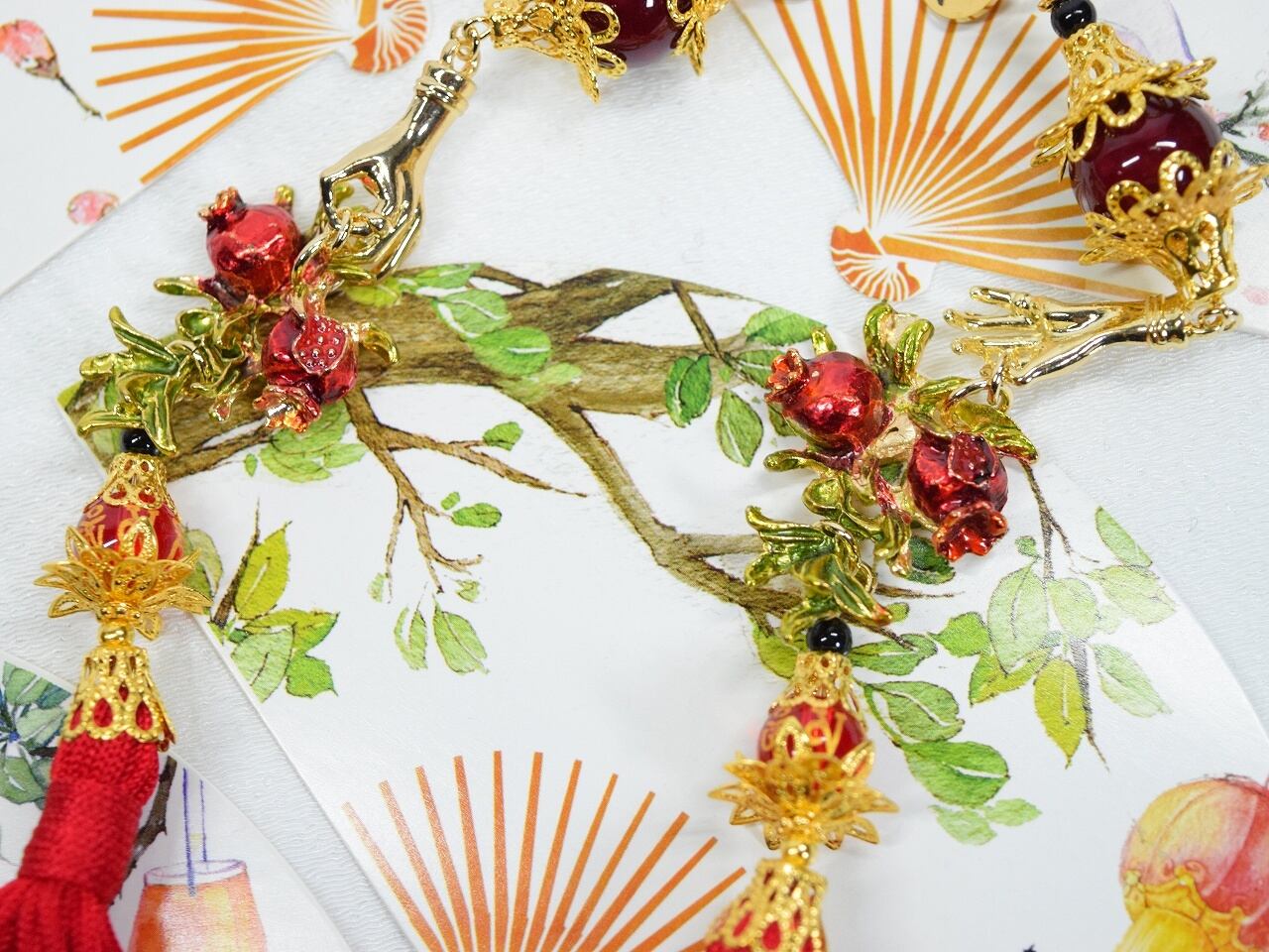 赤い柘榴のモチーフを摘まむハンドモチーフ、梵字の刻まれた赤い石