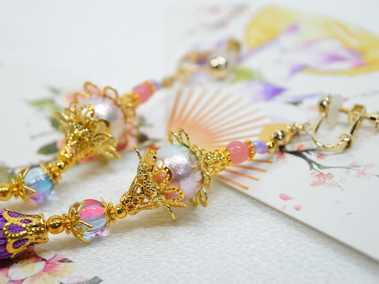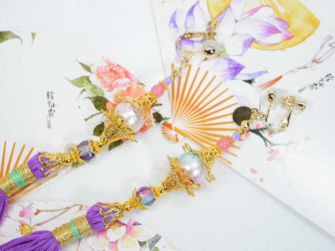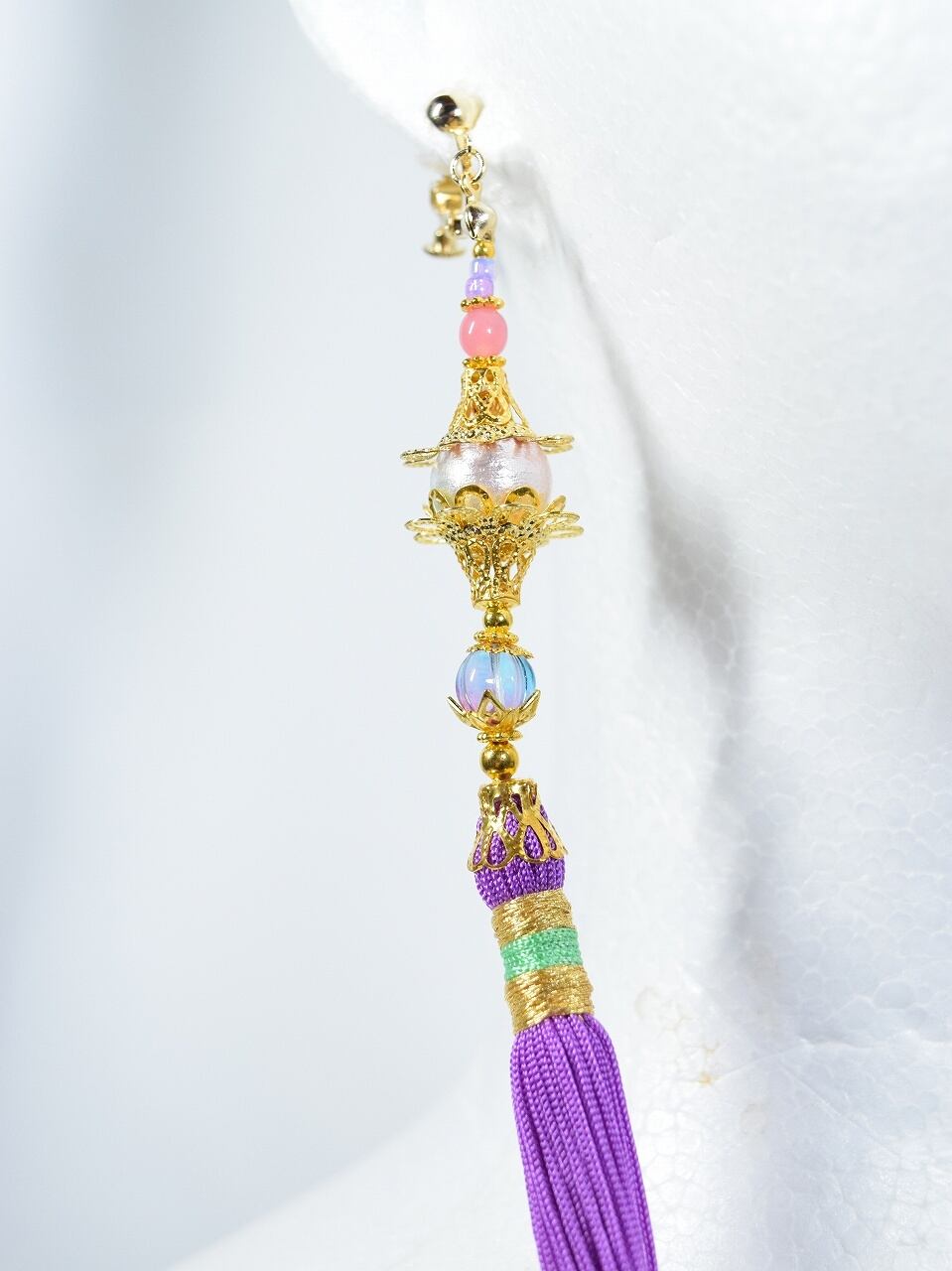ピンク~紫の色味のビーズ、赤みのある紫色のタッセル(杜若色が近いです)