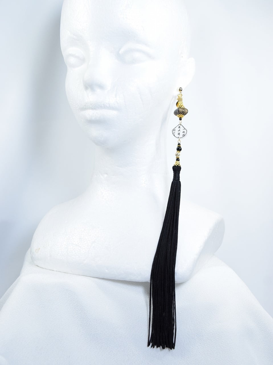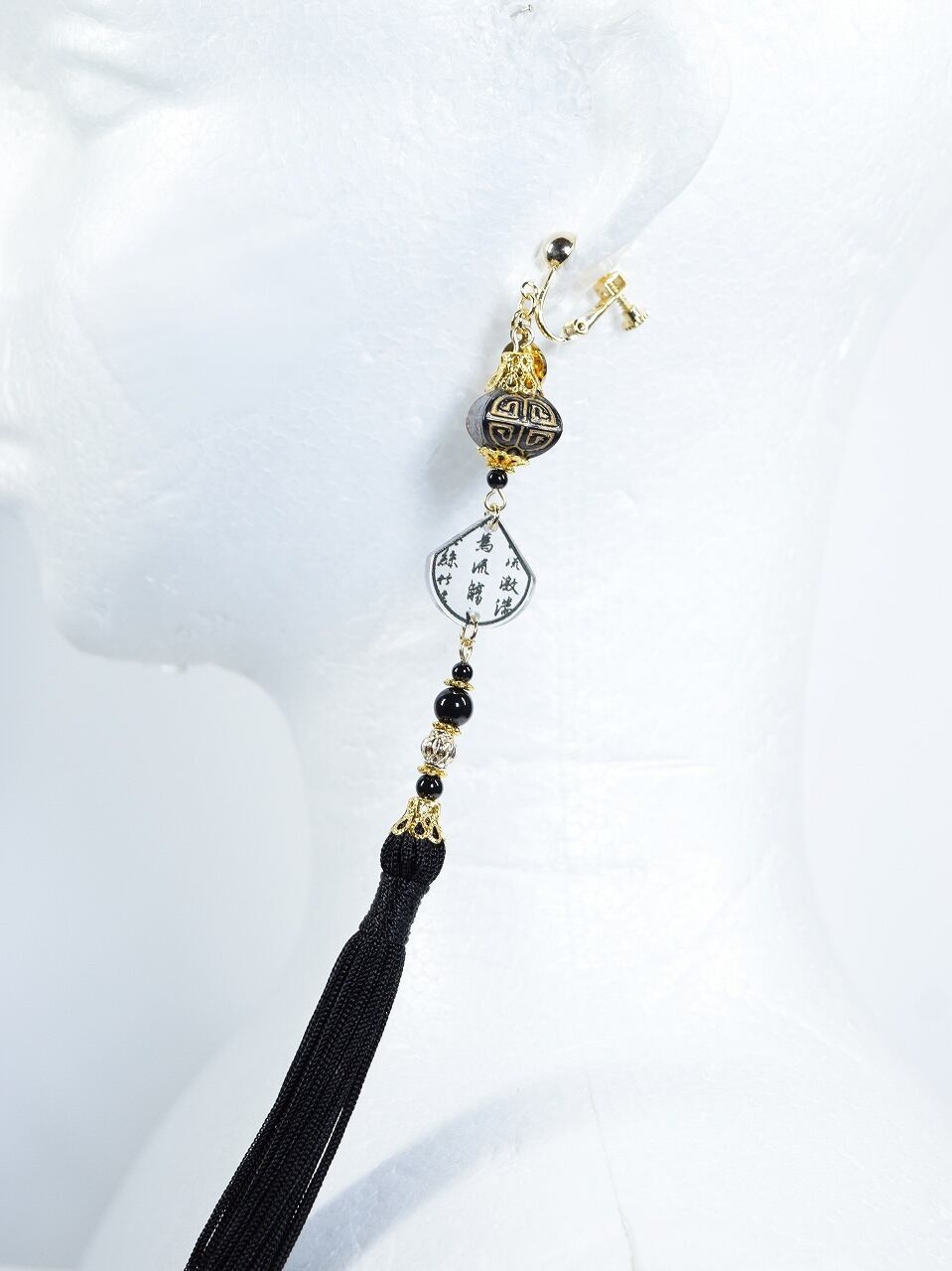 文字と房の耳飾り(黒)イヤリング[AC-024]