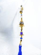 紺の燈籠の飾り、青い石に梵字が刻まれた石と青系ビーズ、鮮やかな青のタッセル