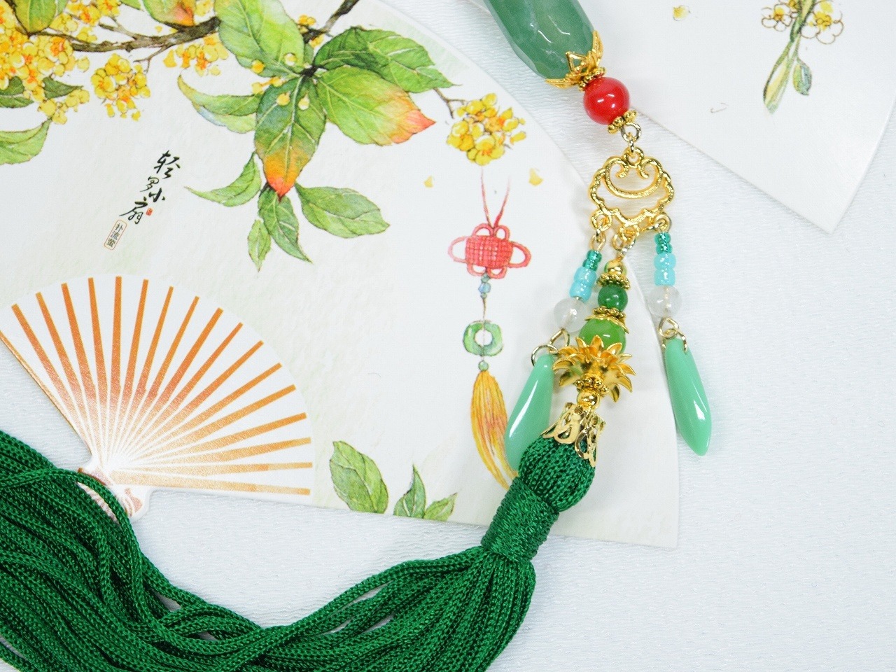 緑の笹竹の扇、濃い翡翠色の雲と雫、金色の雲と赤い石、緑の翡翠色の石と蓮のモチーフの飾り