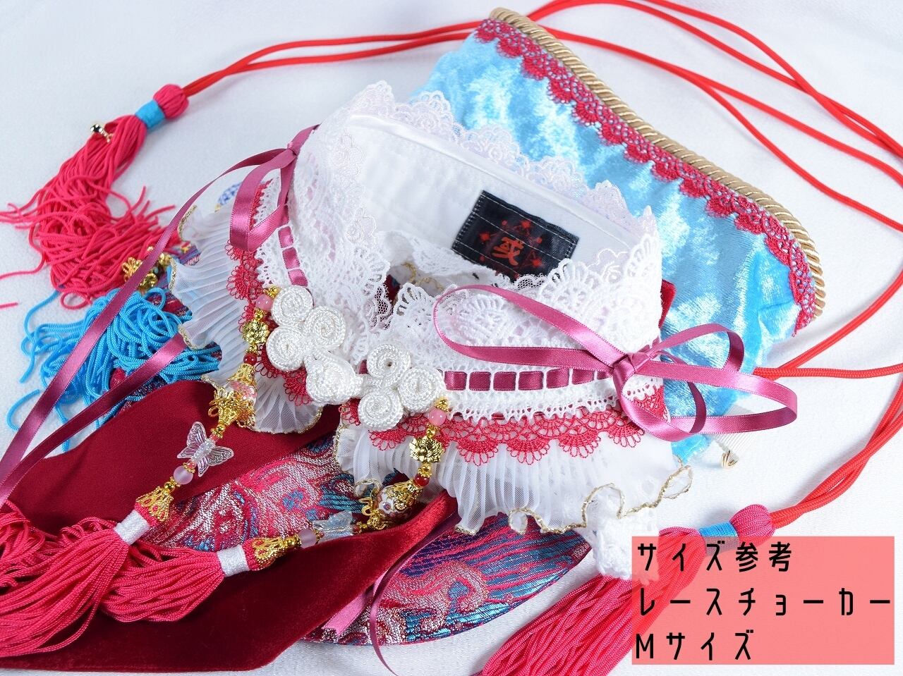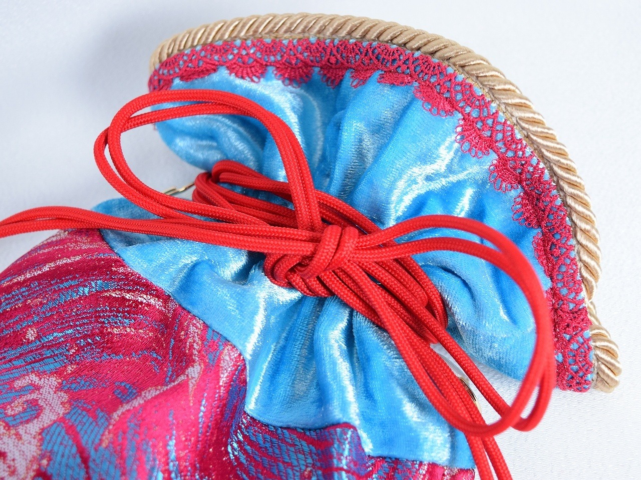 生地:紅色に水色の波模様のチャイナ生地と水色のベロア