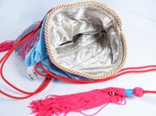 紐の先にタッセル飾り、ポーチの底部分には取り外しできるチャームのタッセル飾り