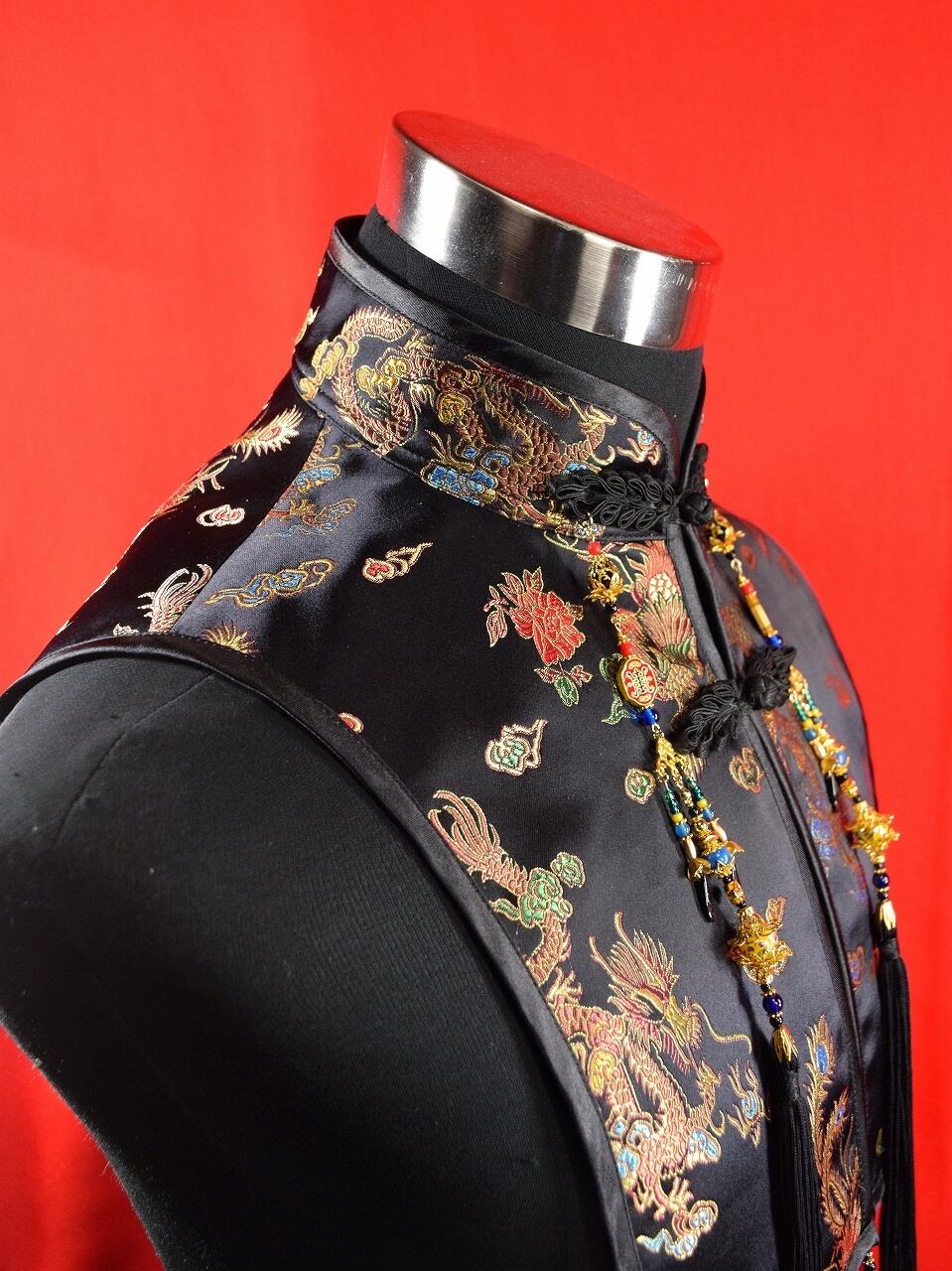 前は胸元まで裾があり、襟部分に着脱用のチャイナボタン