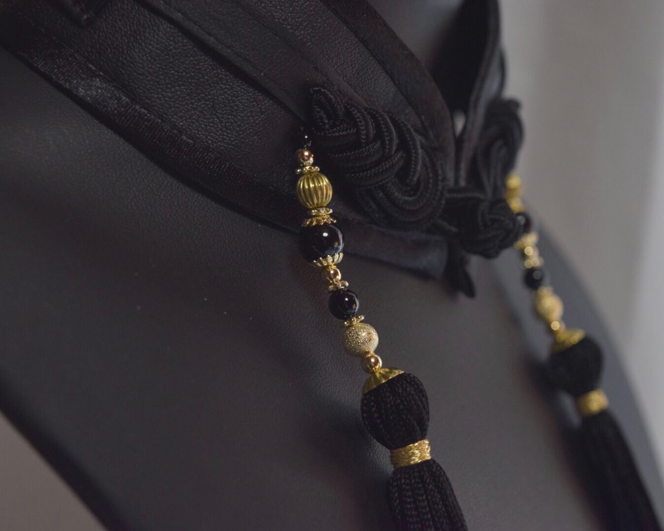 装飾:周囲合皮の拘束風ベルト(黒)、全長23cmの房飾り(ビーズ4cm房飾り19cm)黒と金のビーズ使用