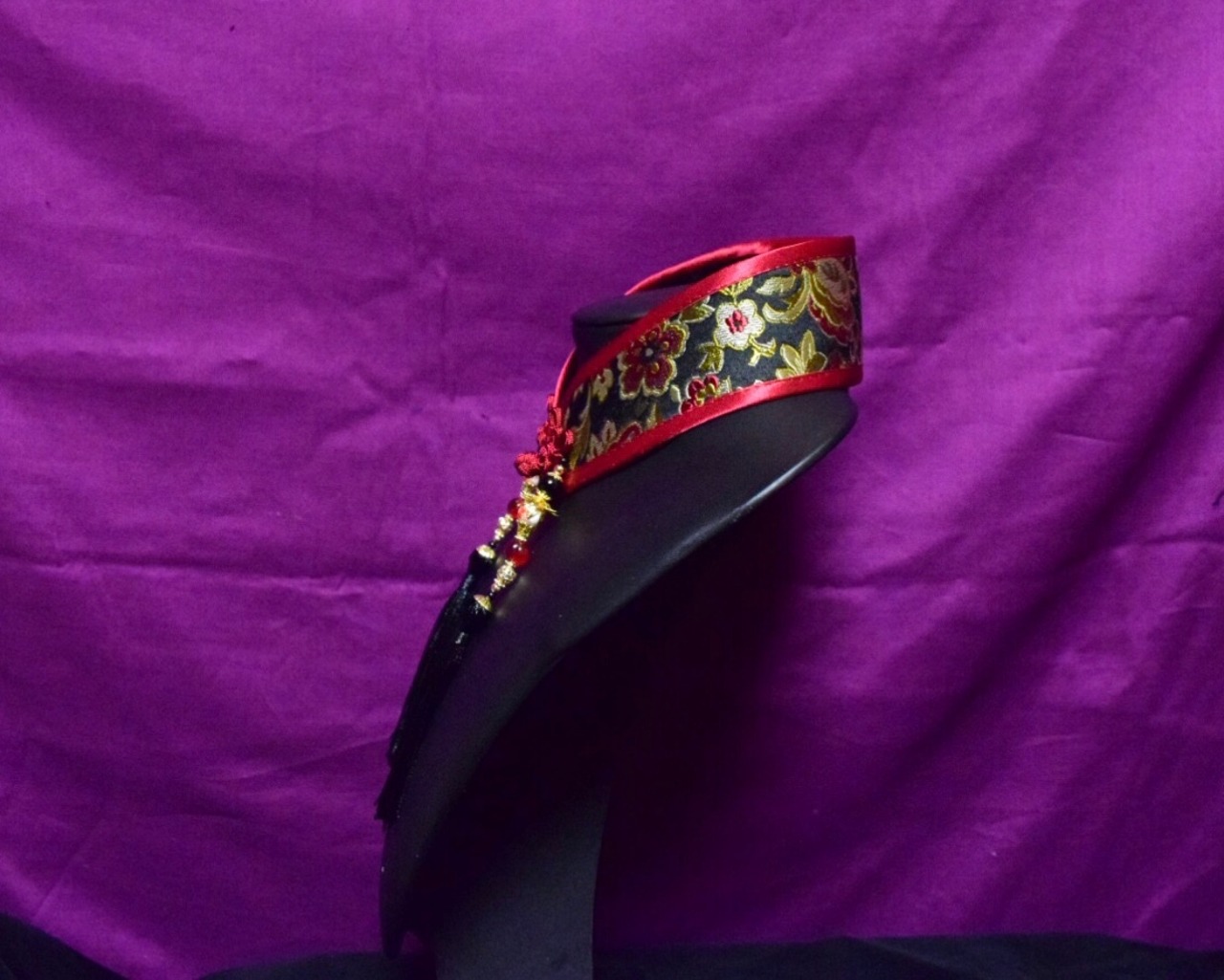 タッセル:黒い房飾りと金、赤い花の陶器ビーズの飾り