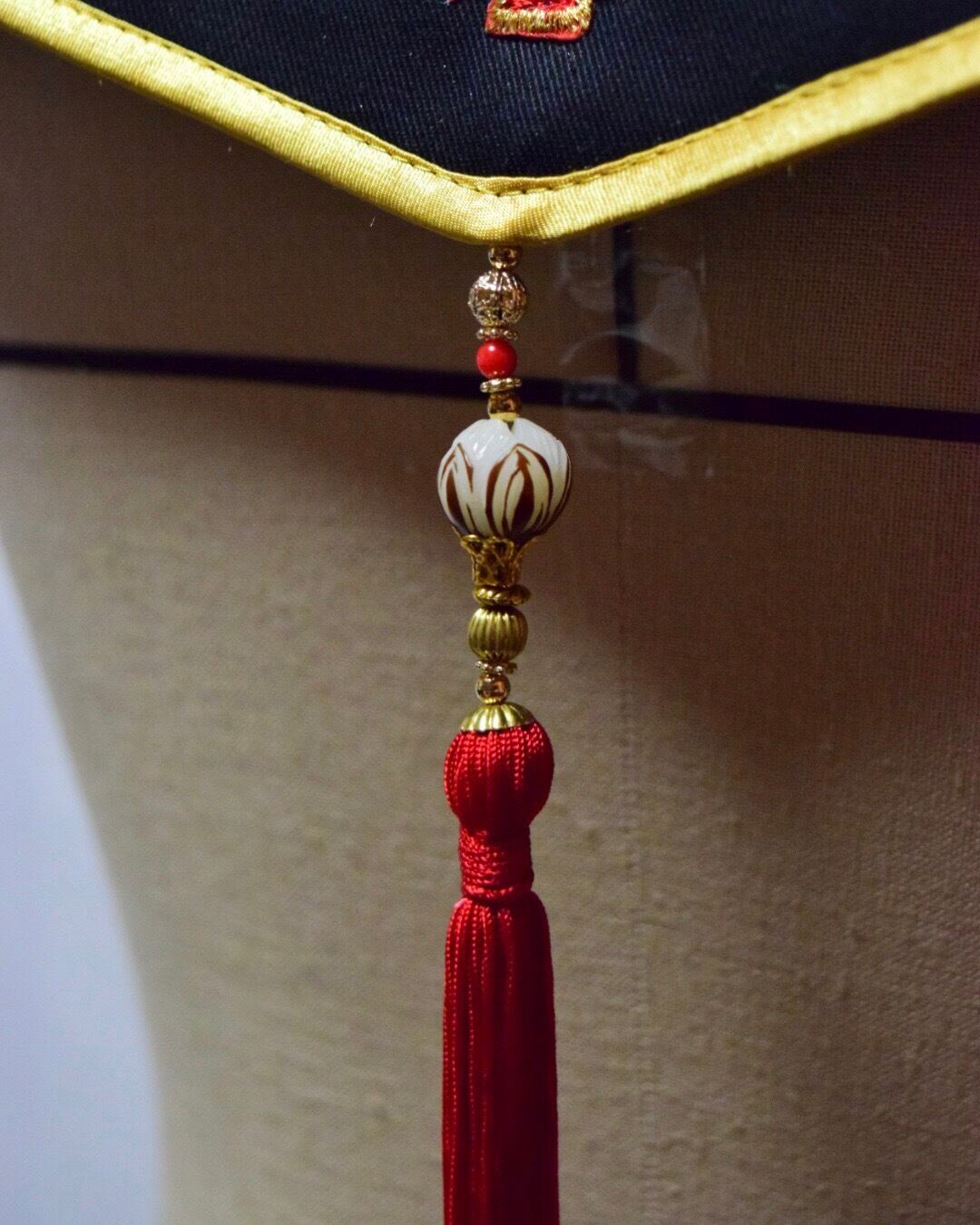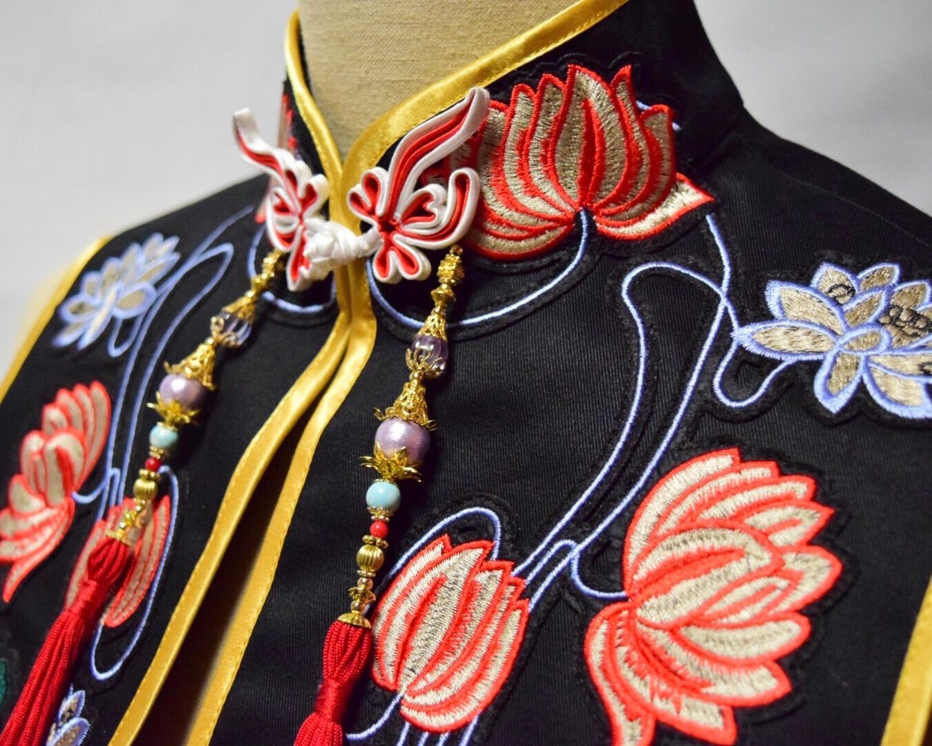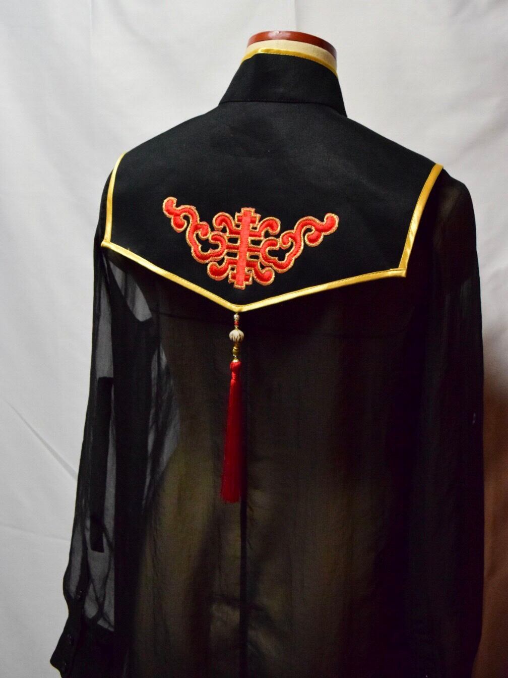 後ろも丈が長めで赤と金の中華紋の刺繍飾りとタッセルが付いています