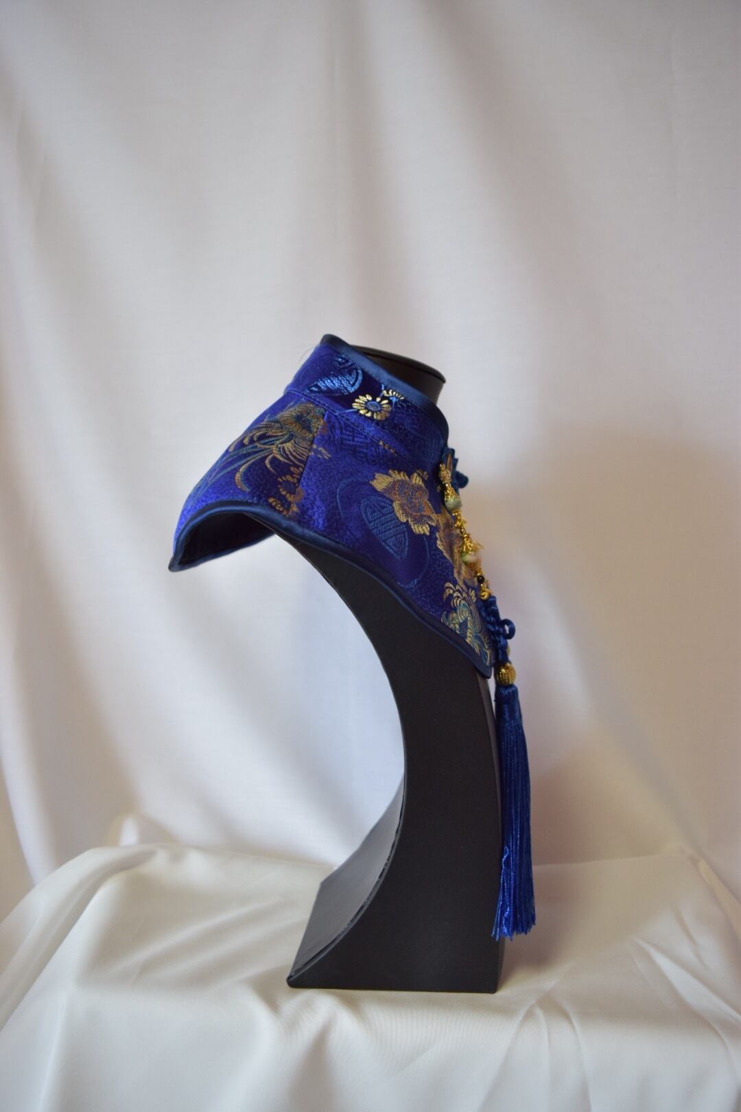生地:鮮やかな青地に金、水色、緑の菊と芍薬のチャイナ生地