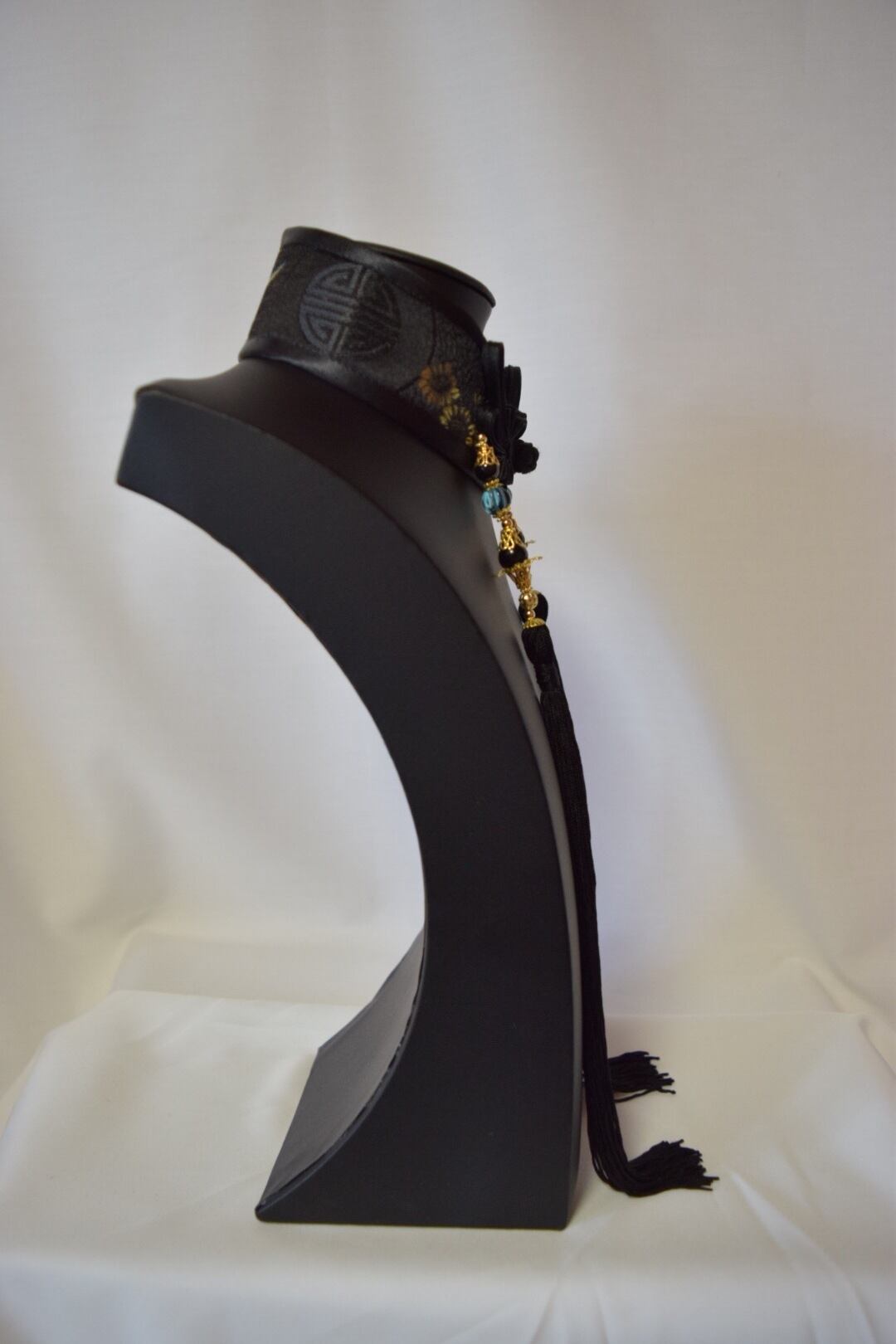 装飾:金と燻んだ水色のビーズ、黒を灯りに燈籠モチーフに装飾、黒い房飾り