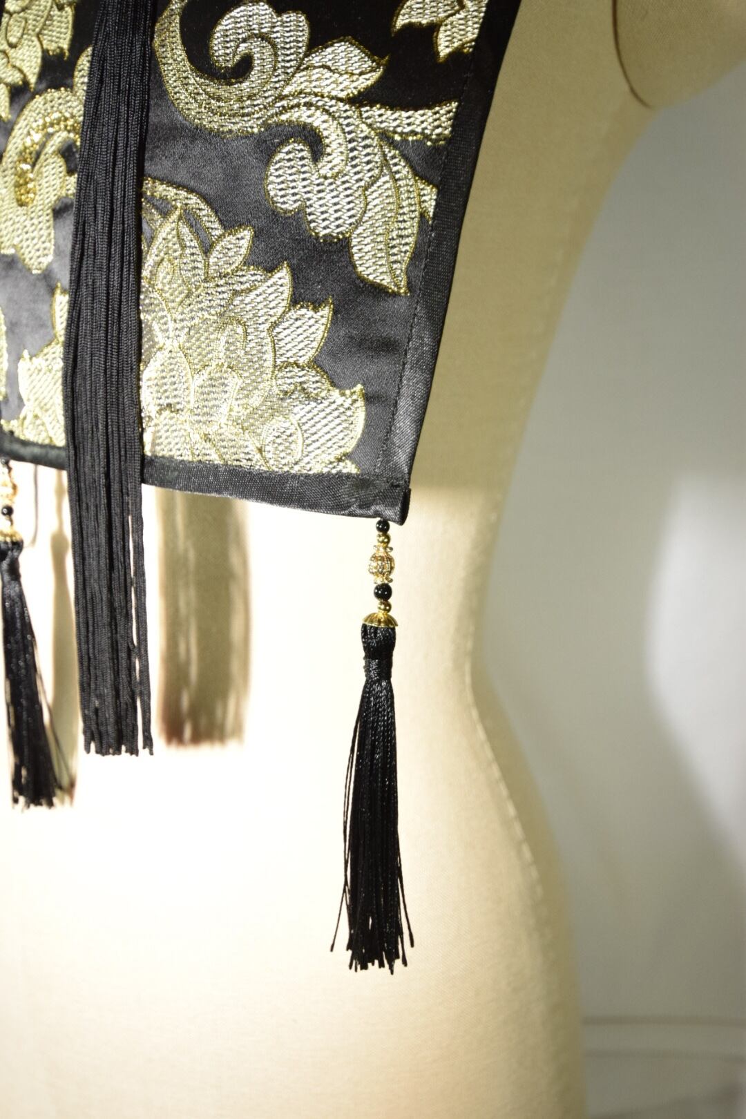 前装飾:梵字のビーズ、黒と金のパーツの組み合わせと金の中華紋様のパーツと黒い房飾り