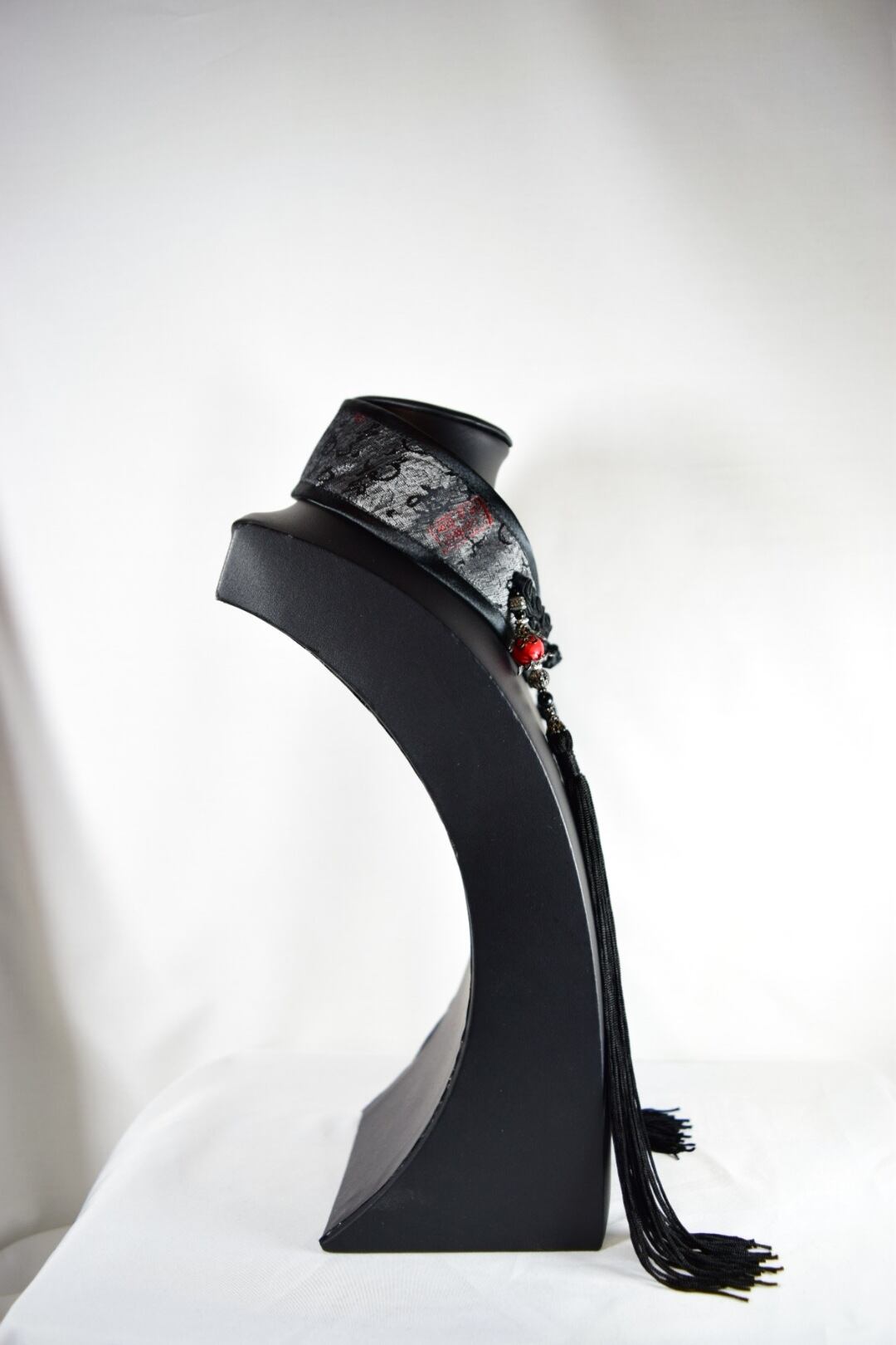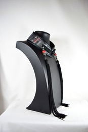 装飾:銀黒、銀パーツと赤のクラックのある石、黒のビーズと黒い長い房飾り