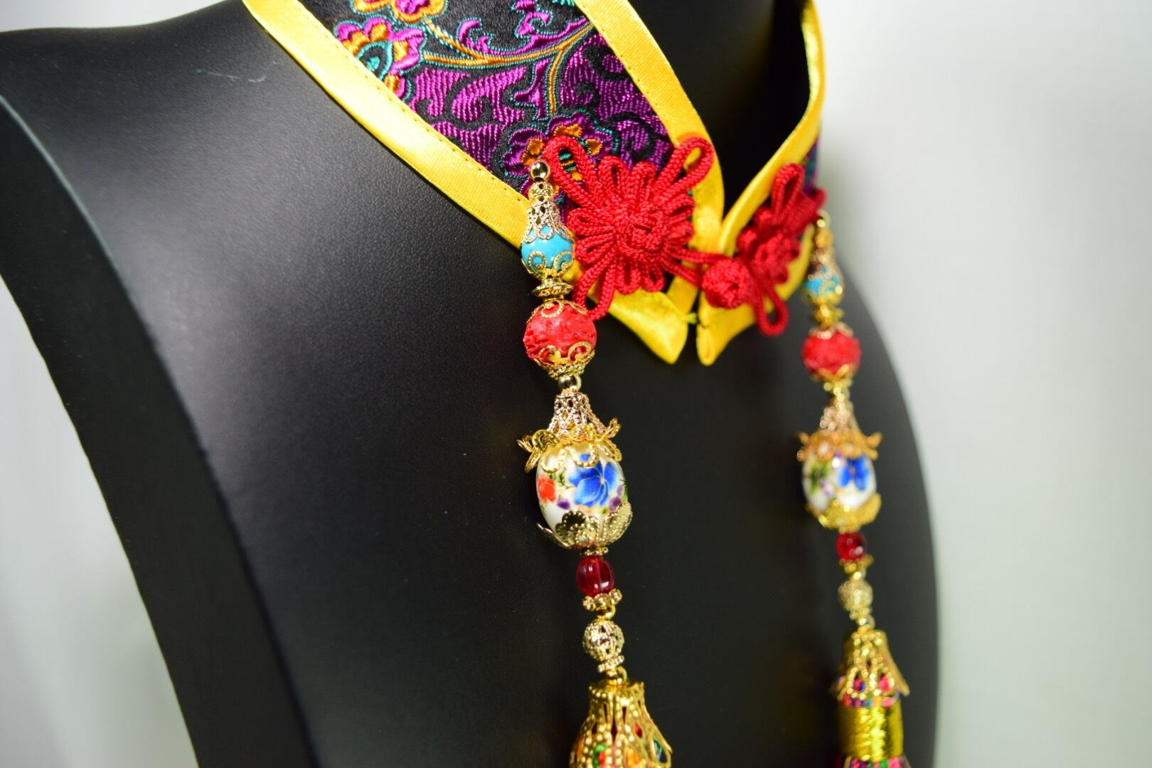 花模様の陶器ビーズの金灯籠モチーフ、グラスビーズ、ターコイズ、福の刻まれた色とりどりのパーツを使用。