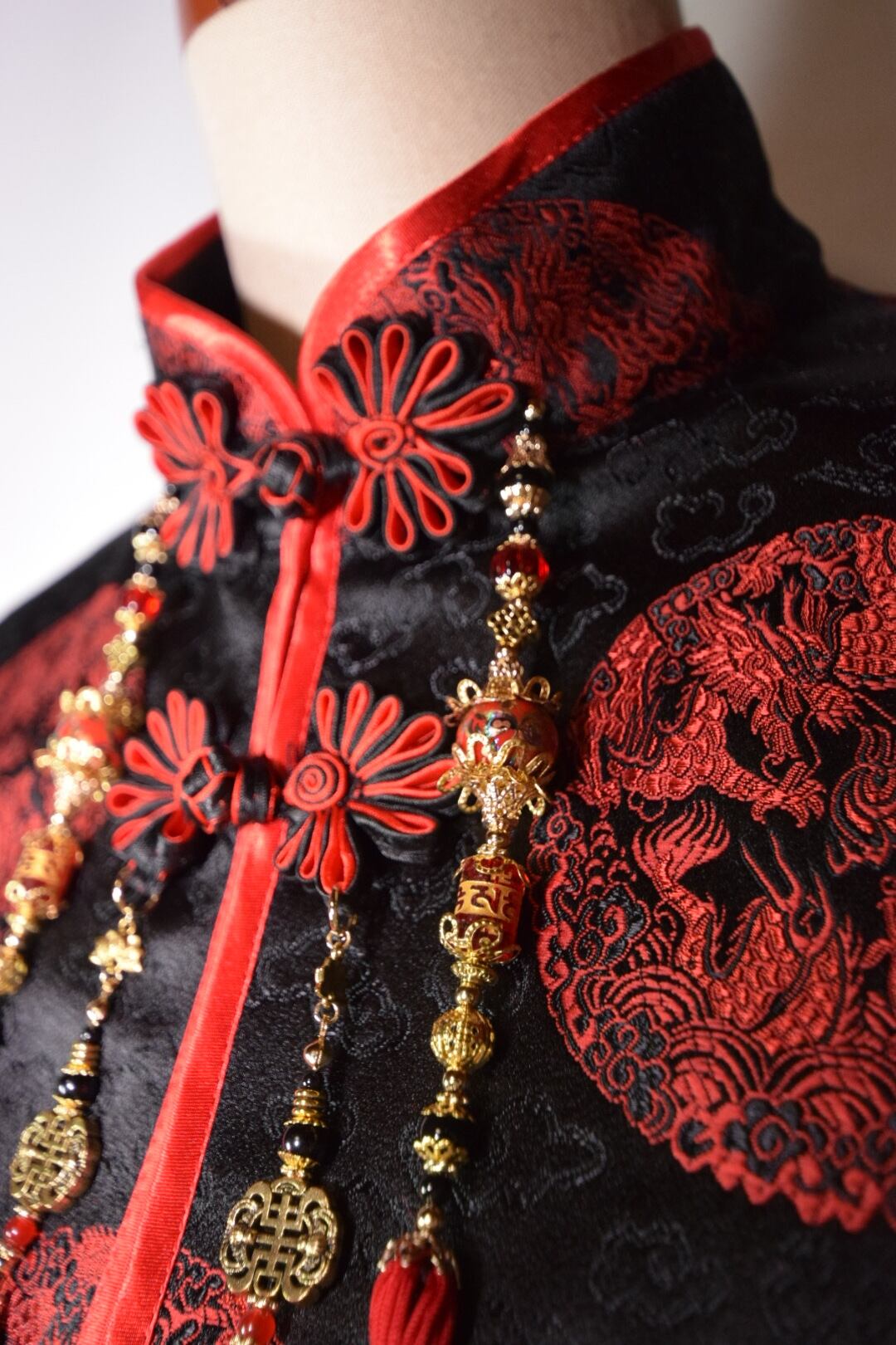 第二ボタン装飾:金の中華紋様のパーツと赤い房飾り
