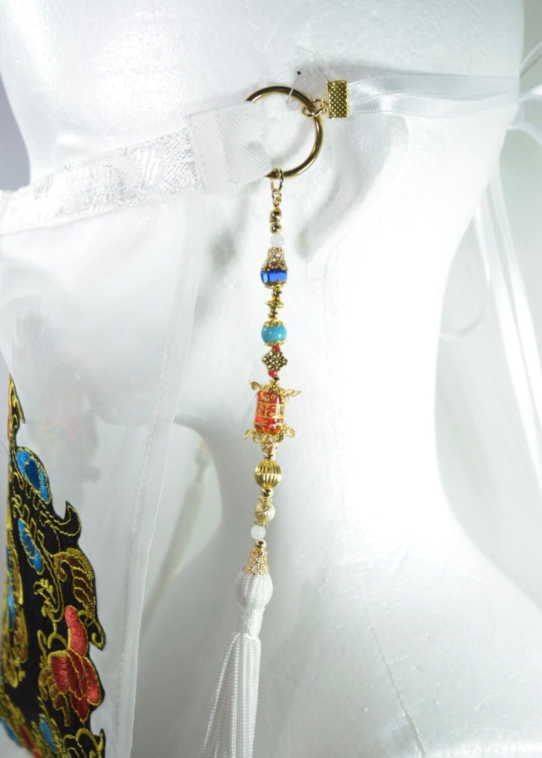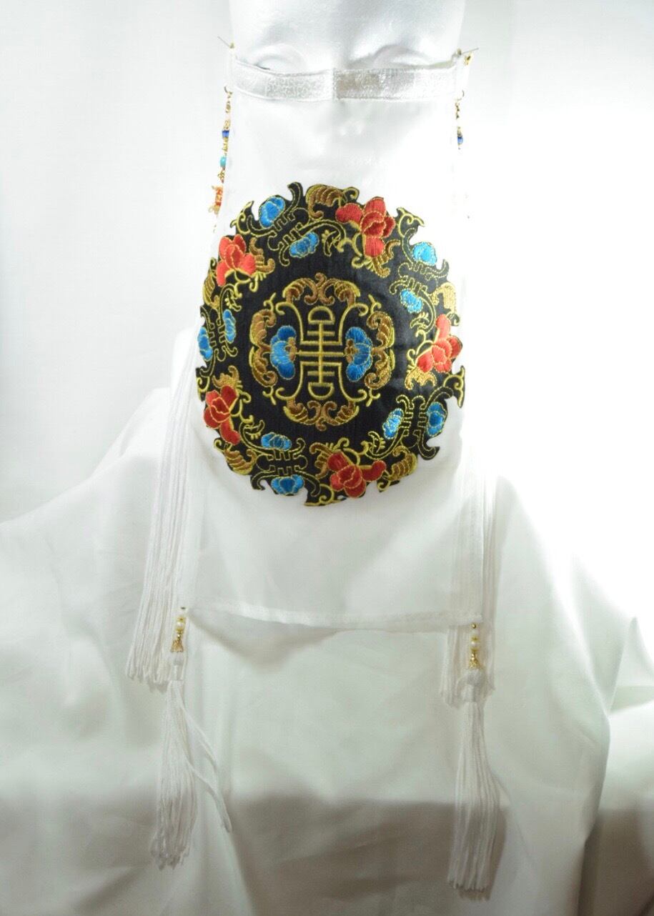 本体生地:白の透ける生地に大きい円の中華紋様の刺繍装飾