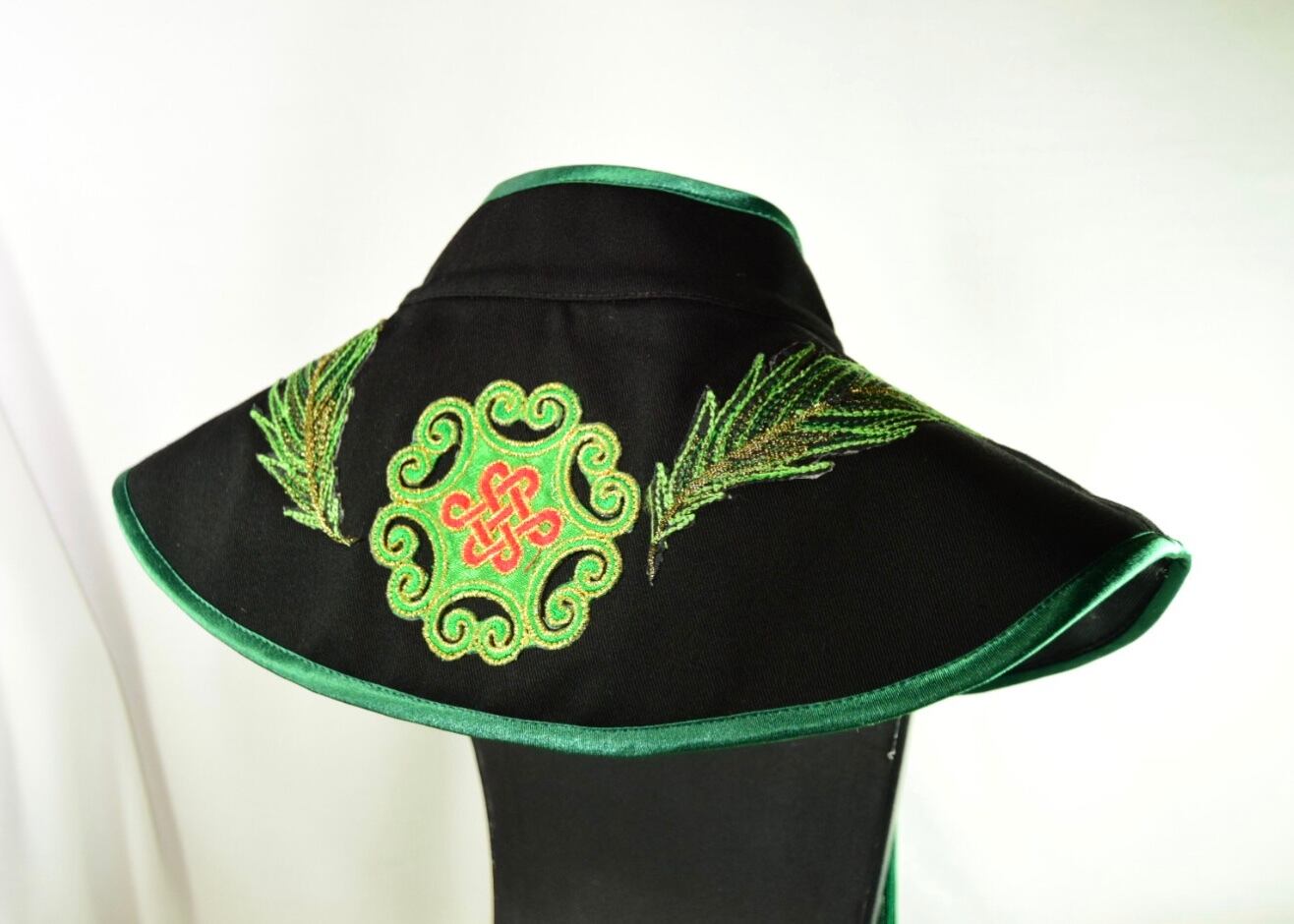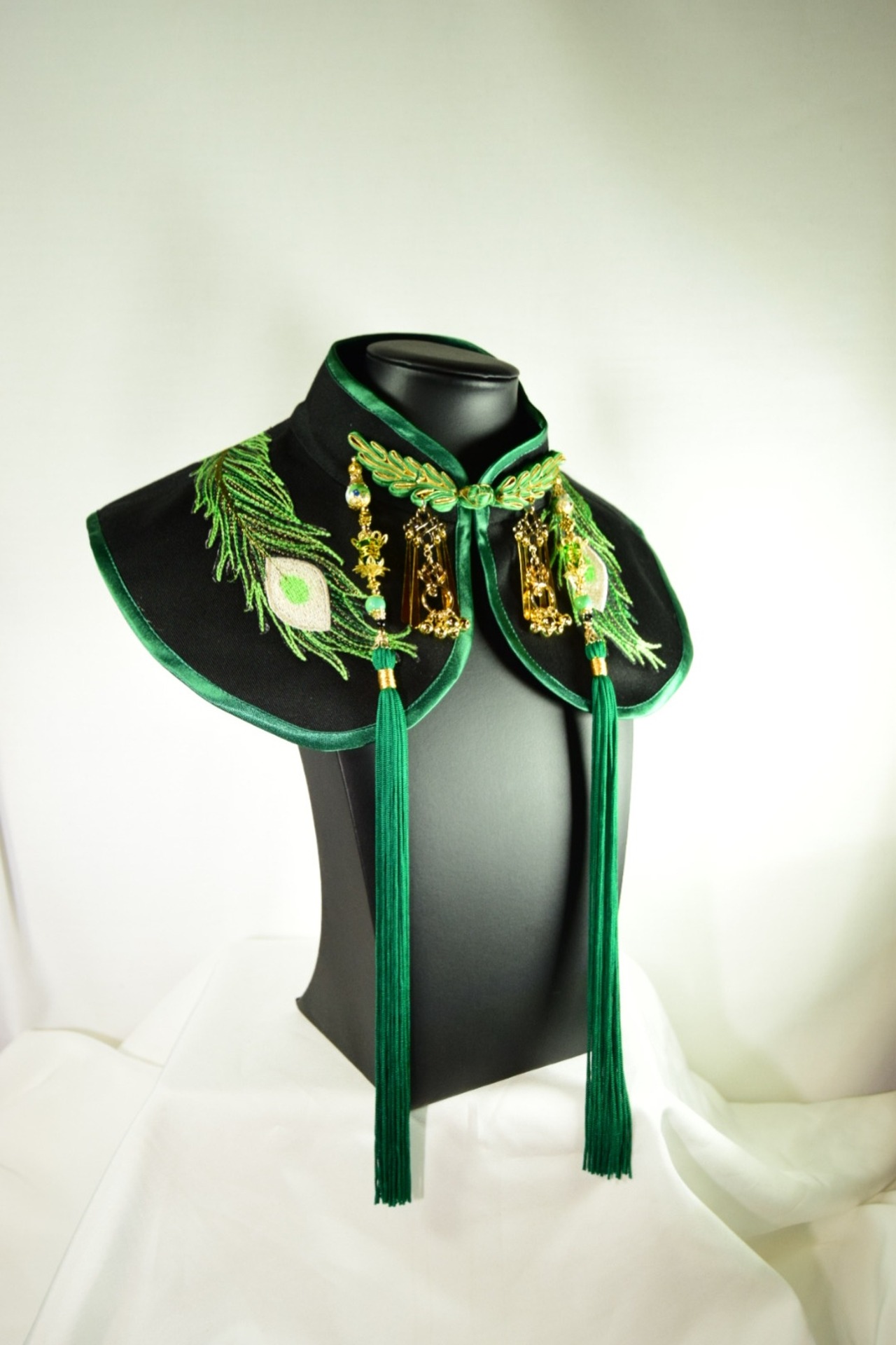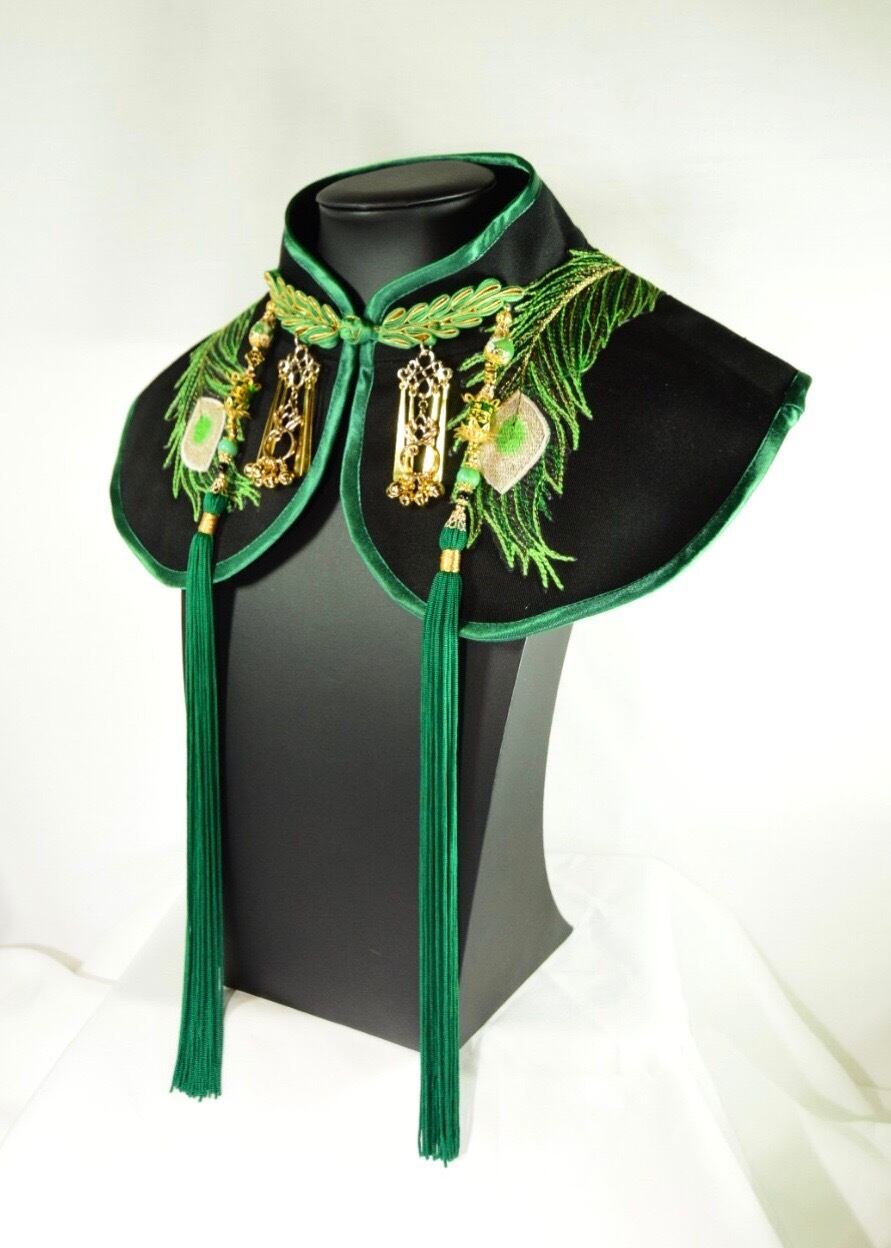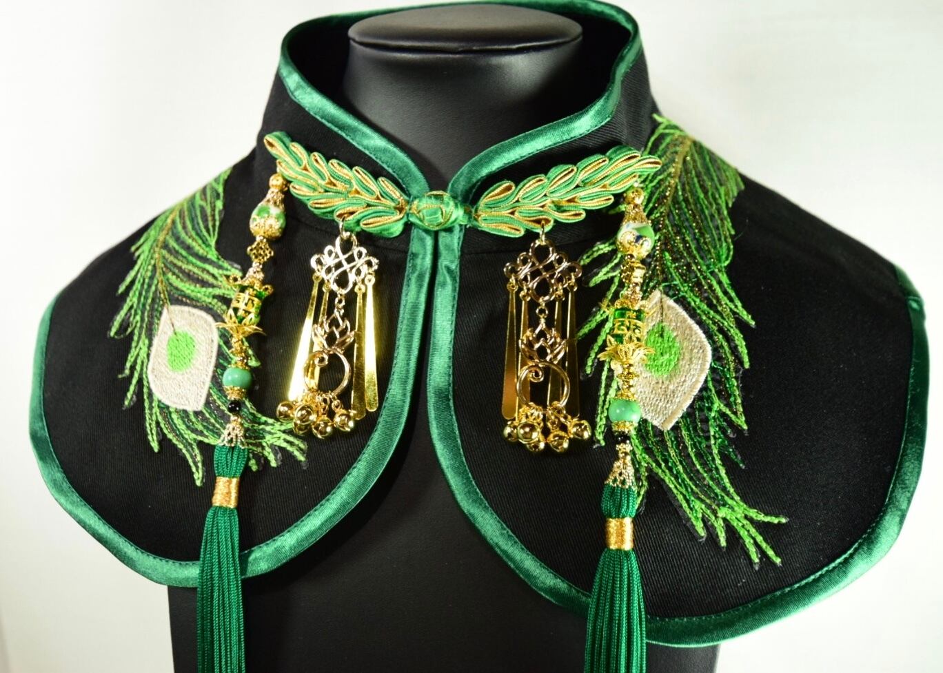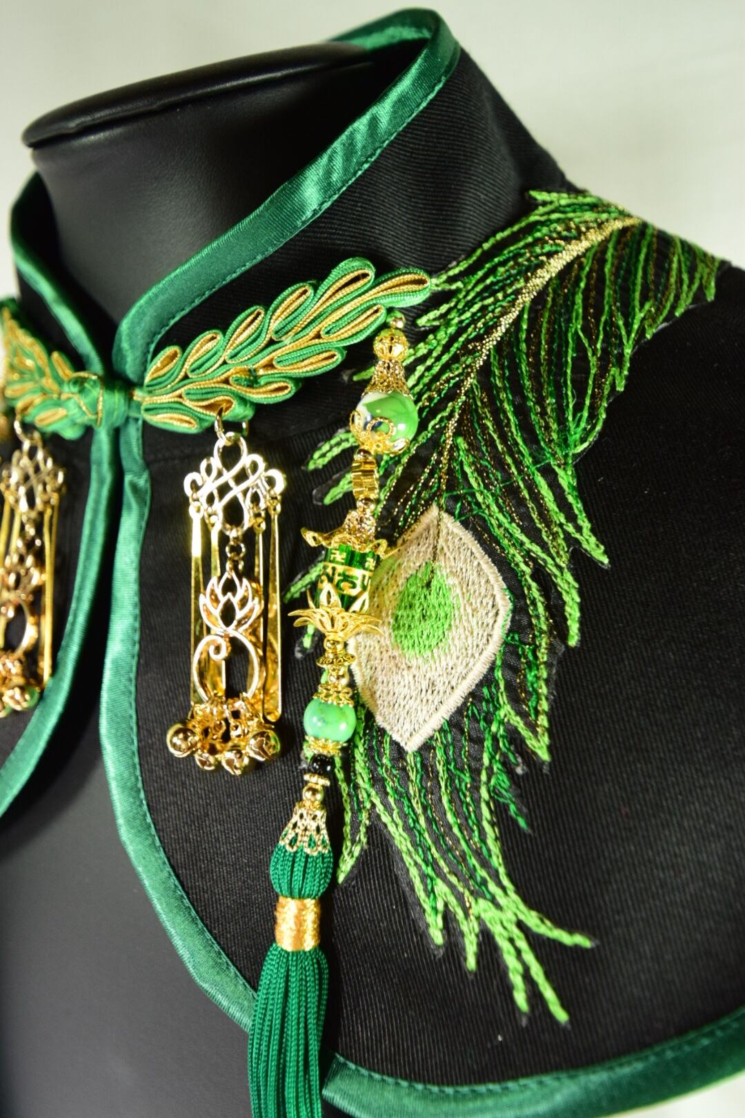 生地:黒無地に孔雀の緑の羽根の刺繍飾りを縫い付け、後ろには緑と金、赤の紋様