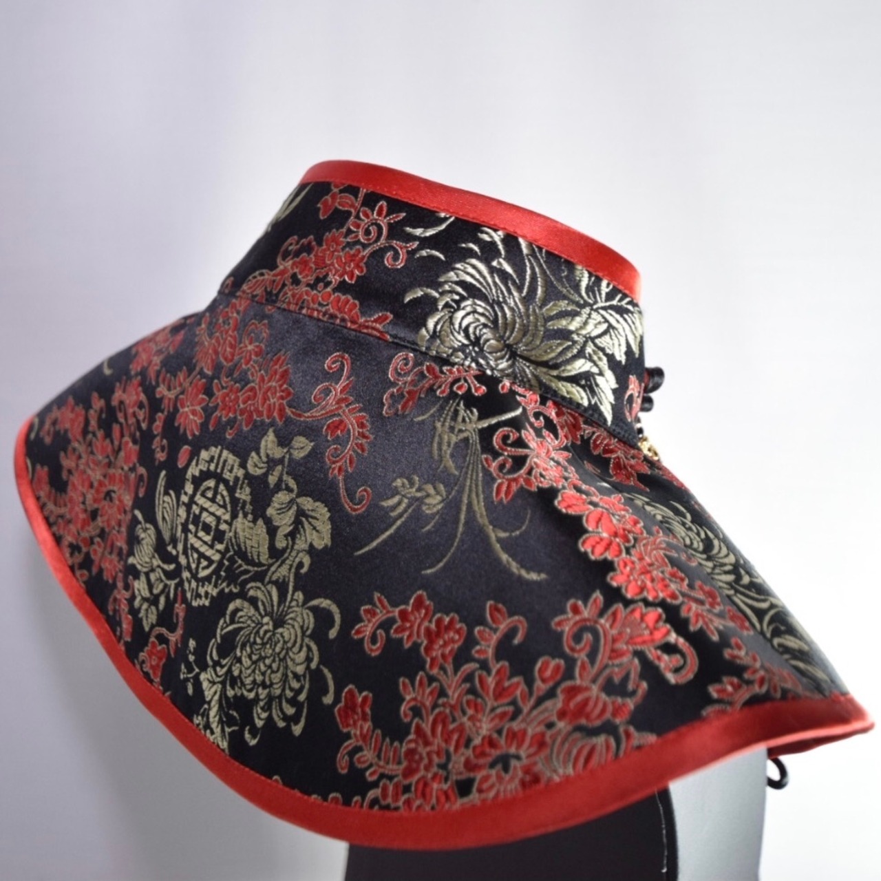 装飾:赤の花模様のビーズ、蓮のモチーフ、赤と黒のビーズを金色のパーツで装飾、黒い結びの房飾り