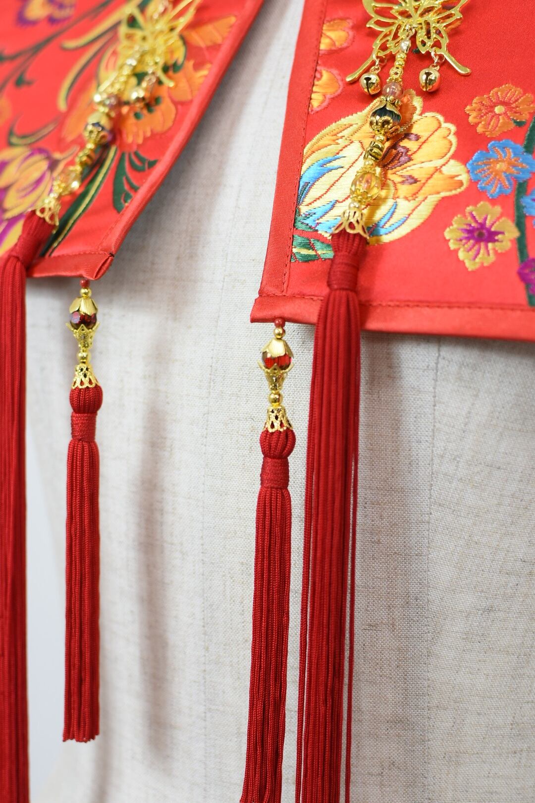 前裾、後ろ裾:左右計4つ端部分に赤と金の装飾に赤い房飾り
