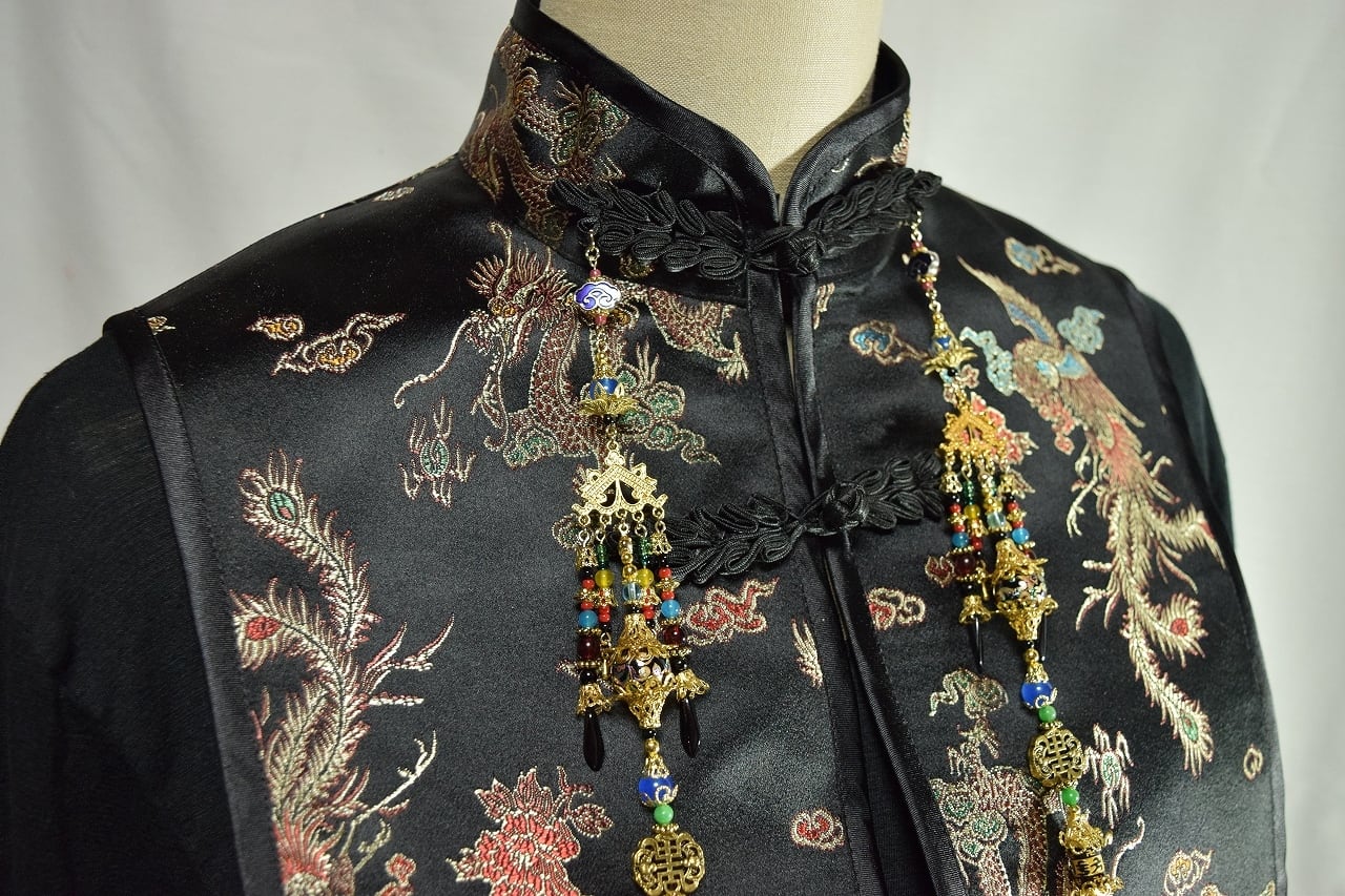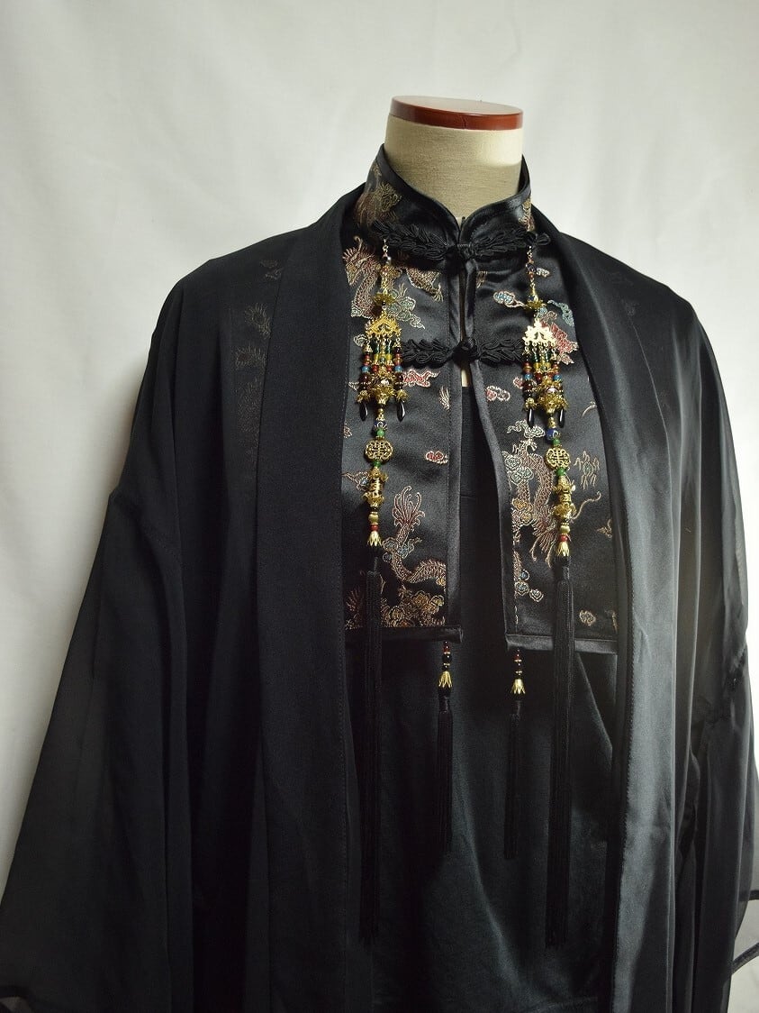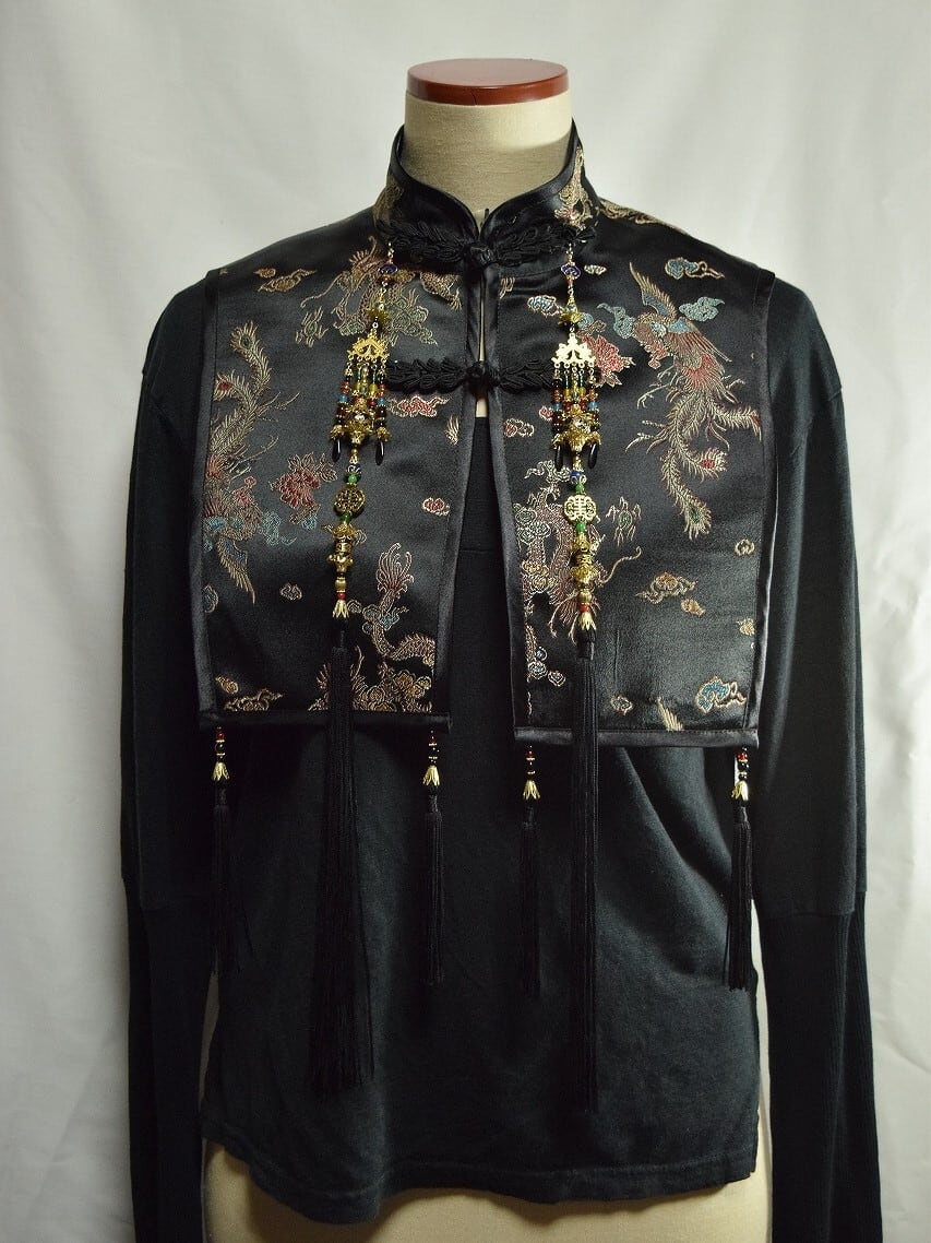 前は胸元まで裾があり、襟、前身頃部分に着脱用のチャイナボタン