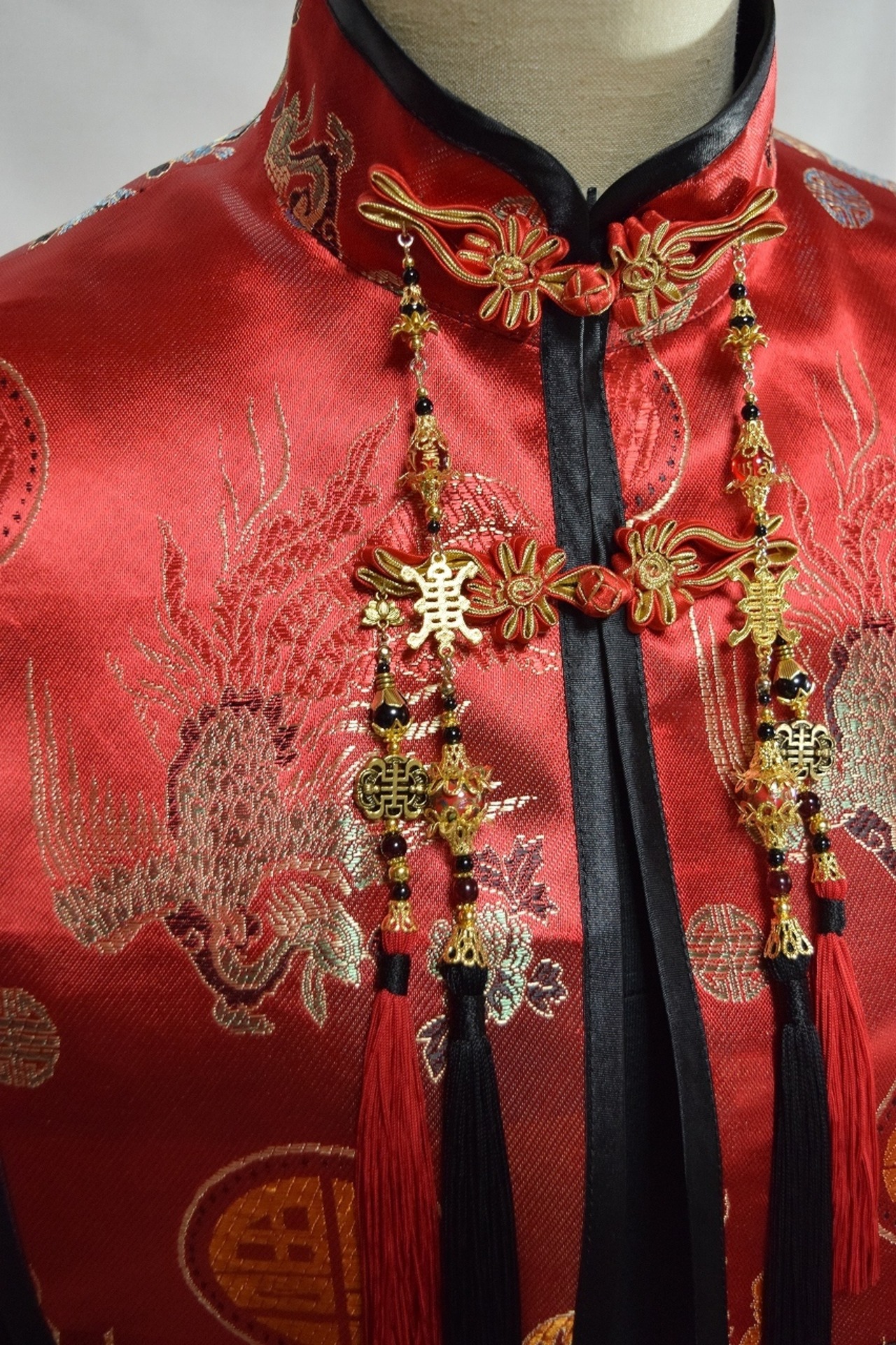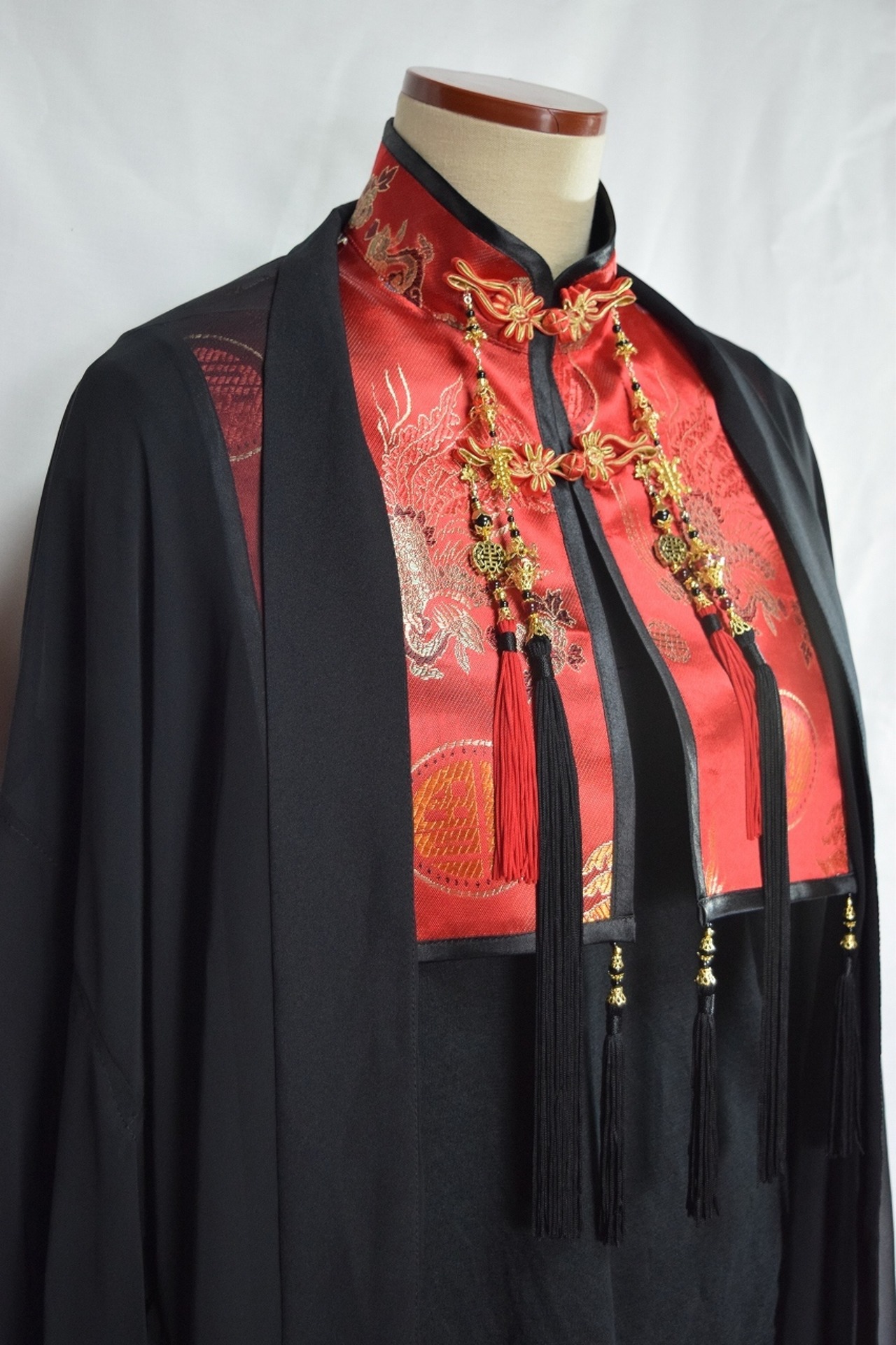 前は胸元まで裾があり、襟、前身頃部分に着脱用のチャイナボタン