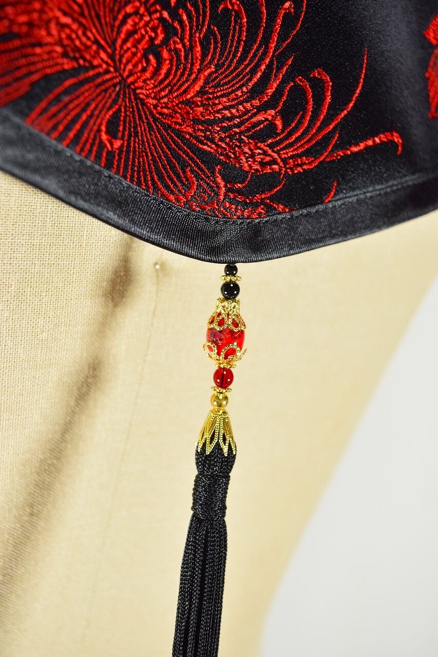 前中心側:吉祥結びモチーフ、赤に金色の梵字、赤いガラスビーズと金色の装飾