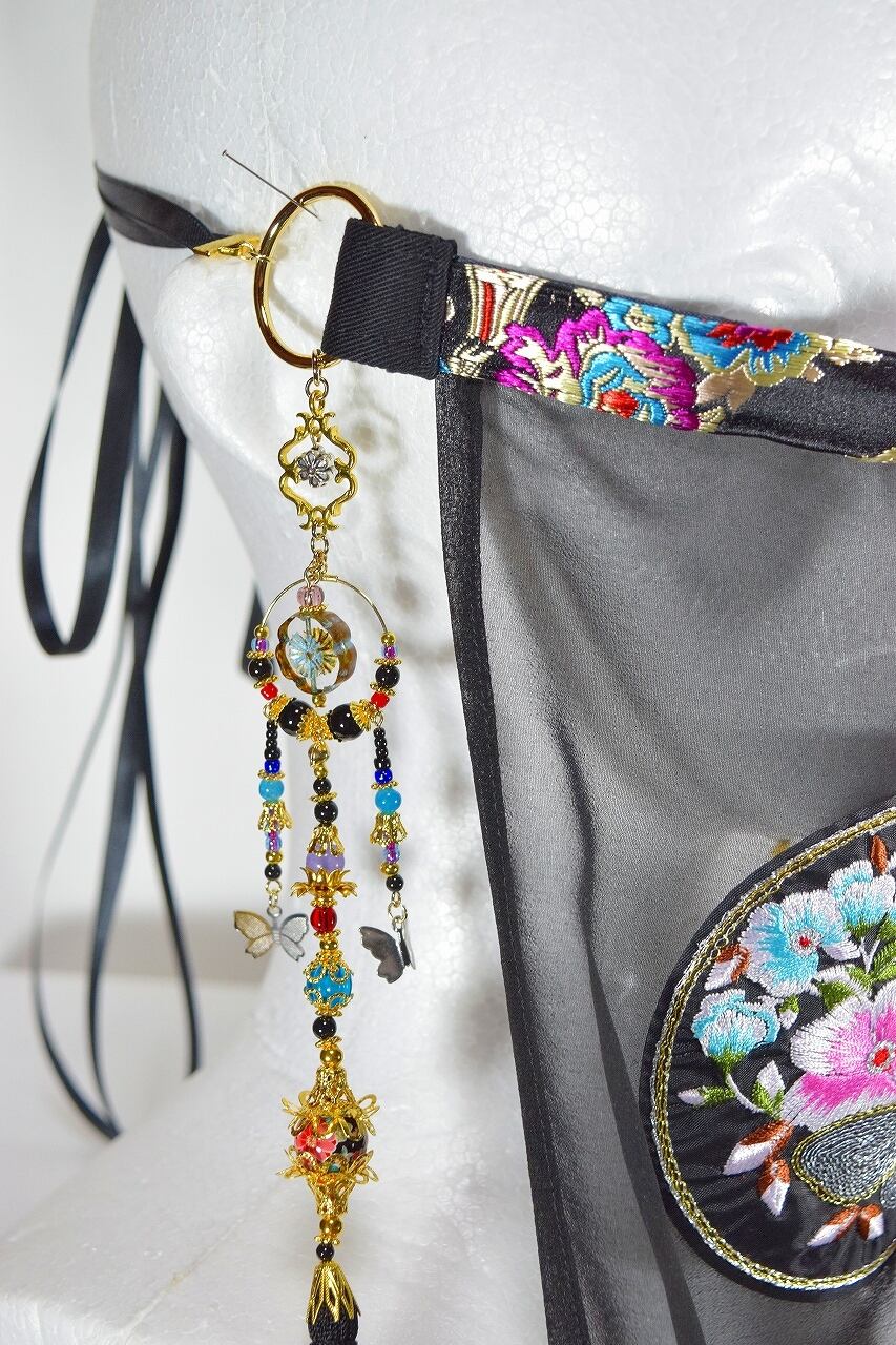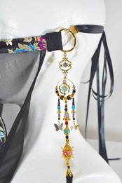 青の花の丸飾り、銀の蝶、絵付けの花、金色の装飾、黒いタッセル