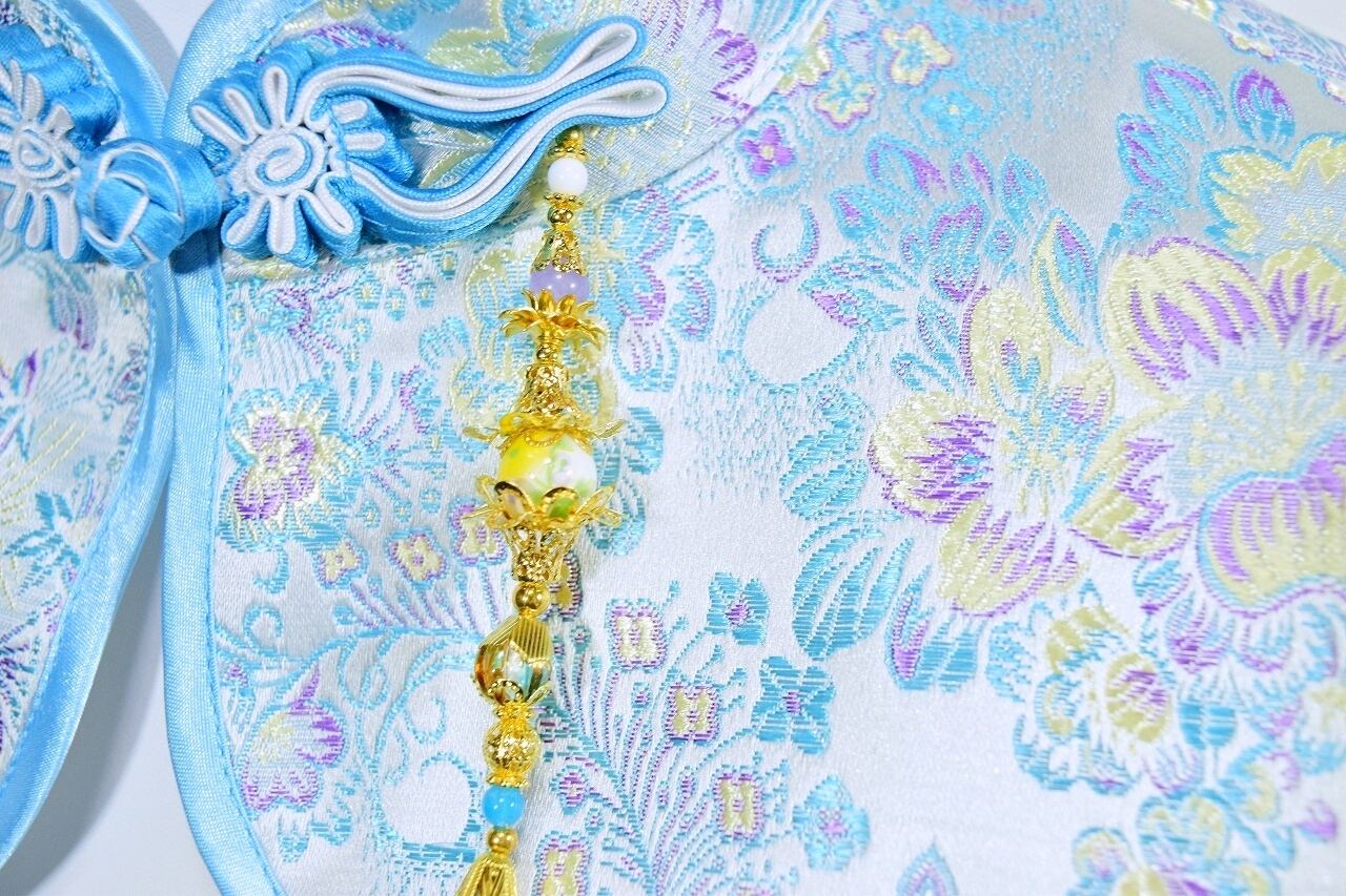 装飾:白地花模様のビーズ、金色のパーツで装飾