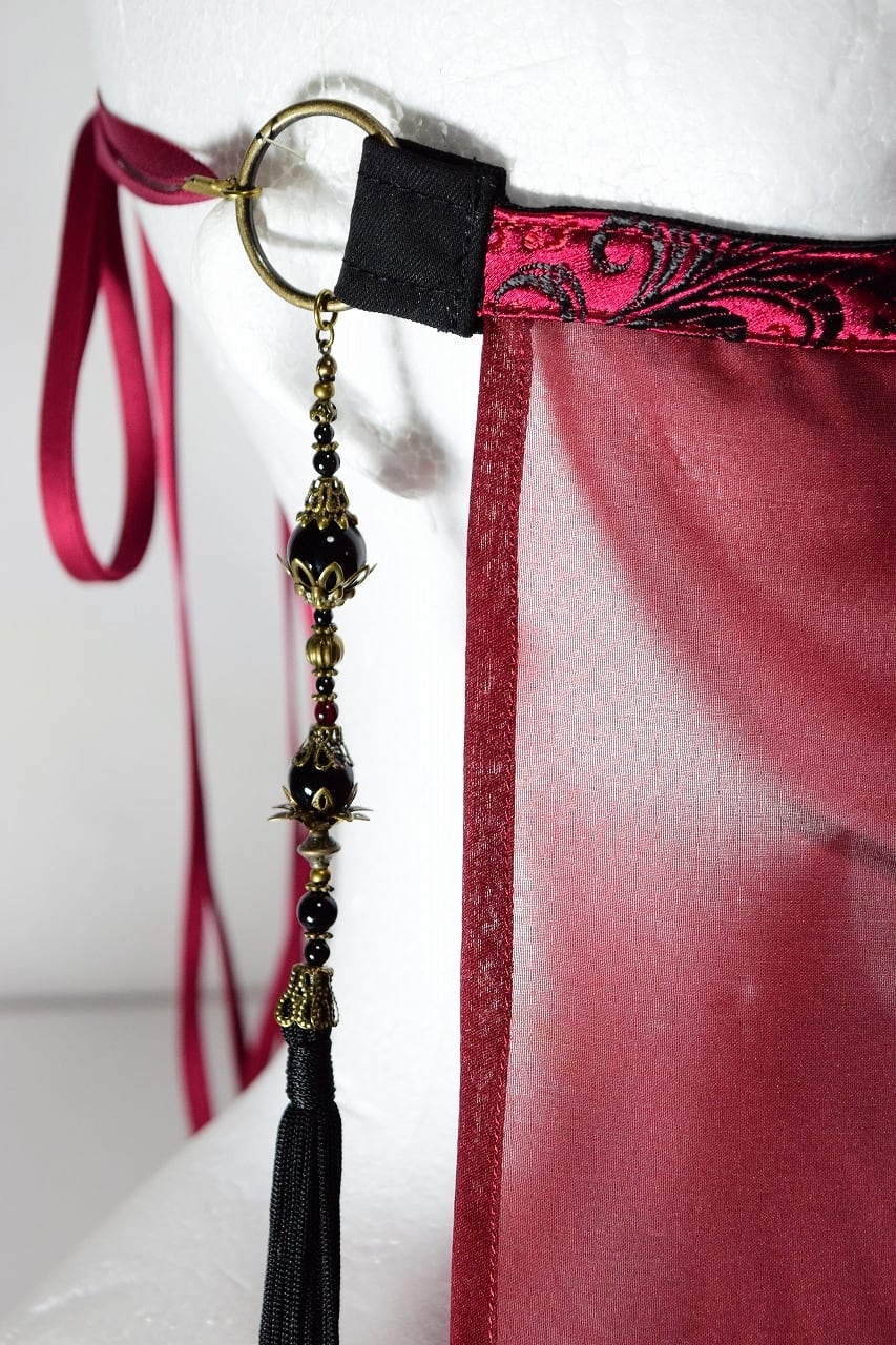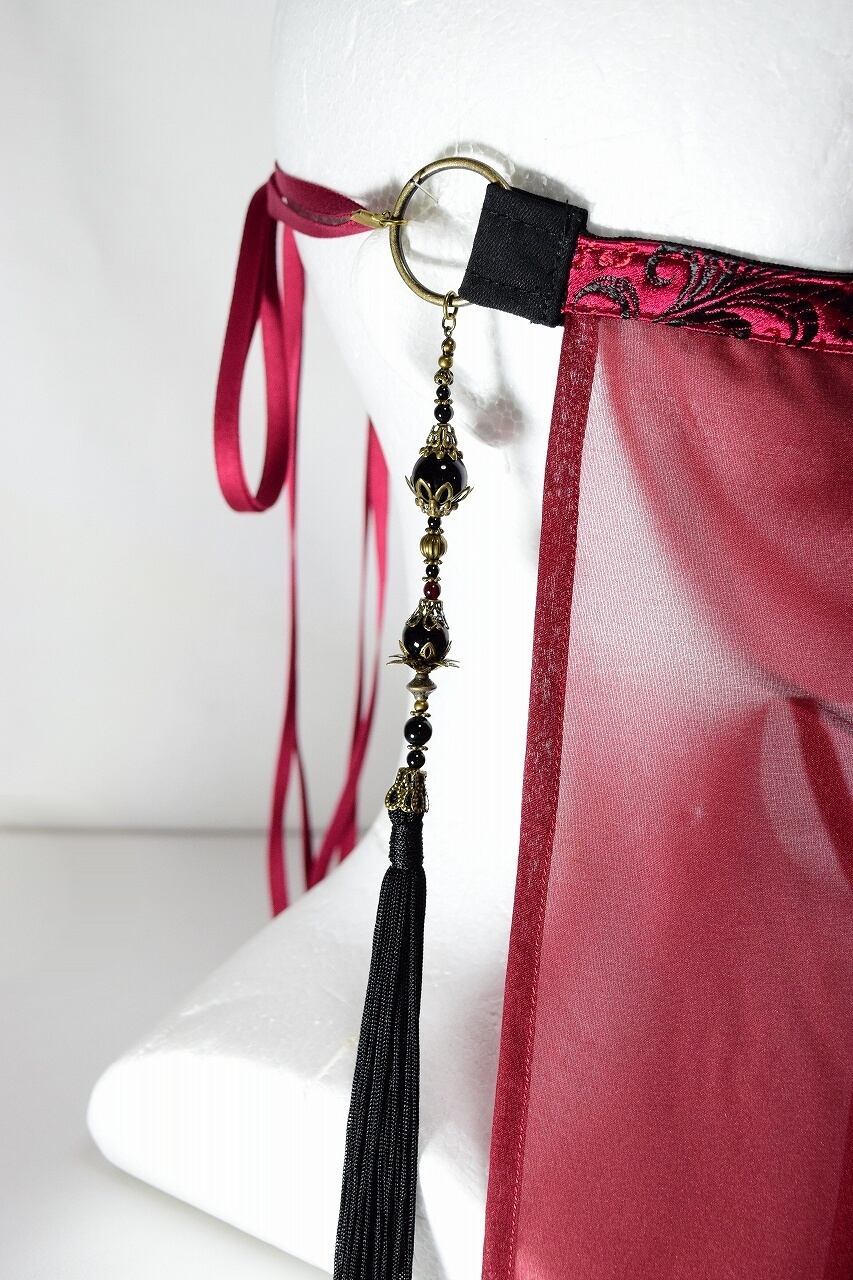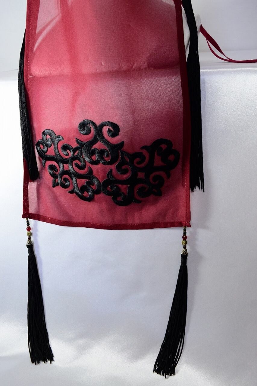 本体生地:臙脂の透ける生地に黒の模様の刺繍飾り