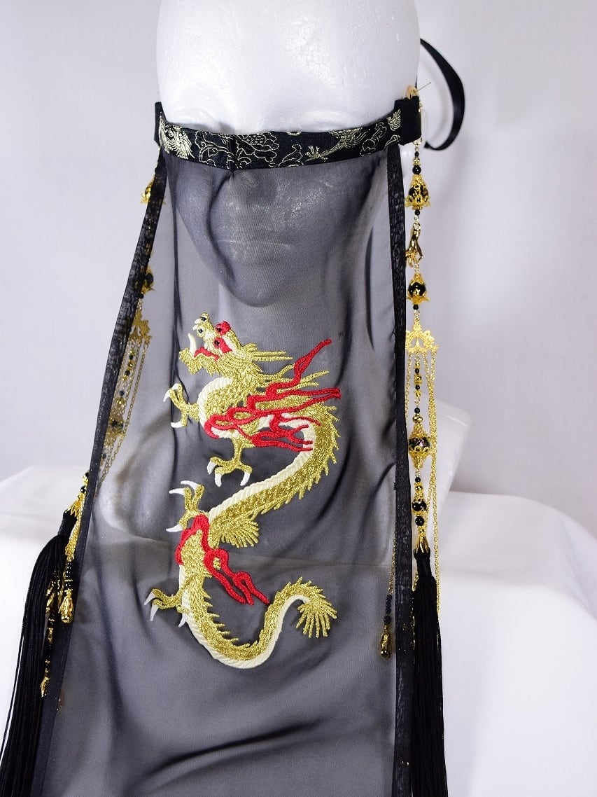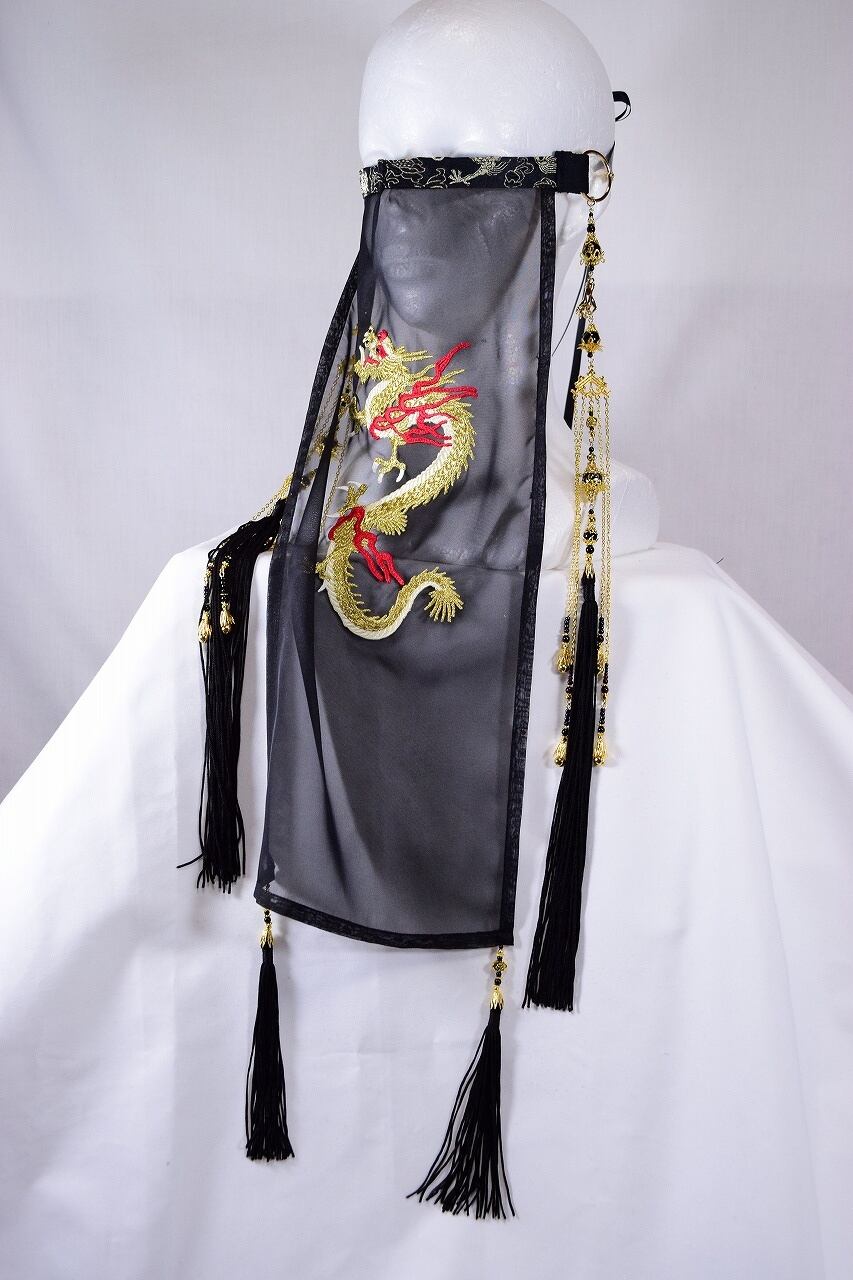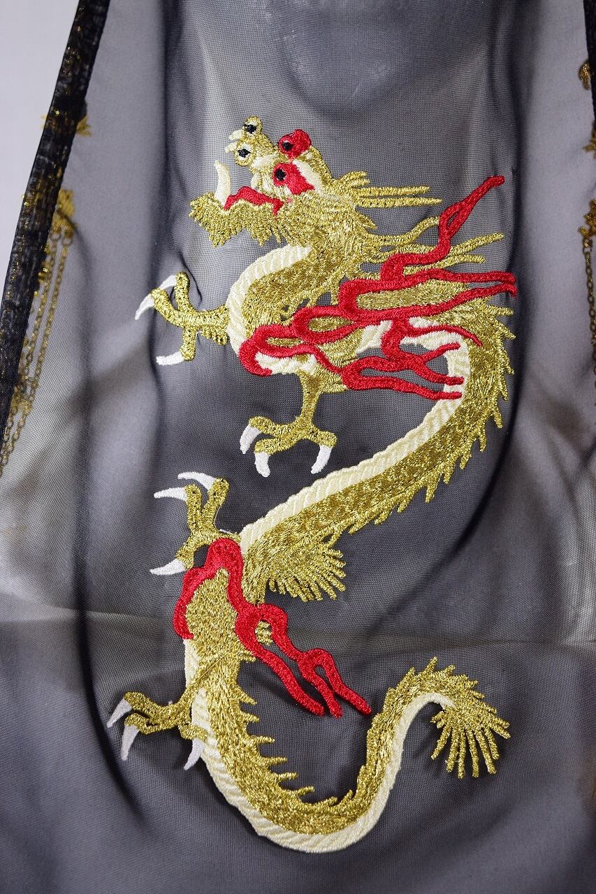 本体生地:黒の透ける生地に金と赤い雲の龍の刺繍飾り